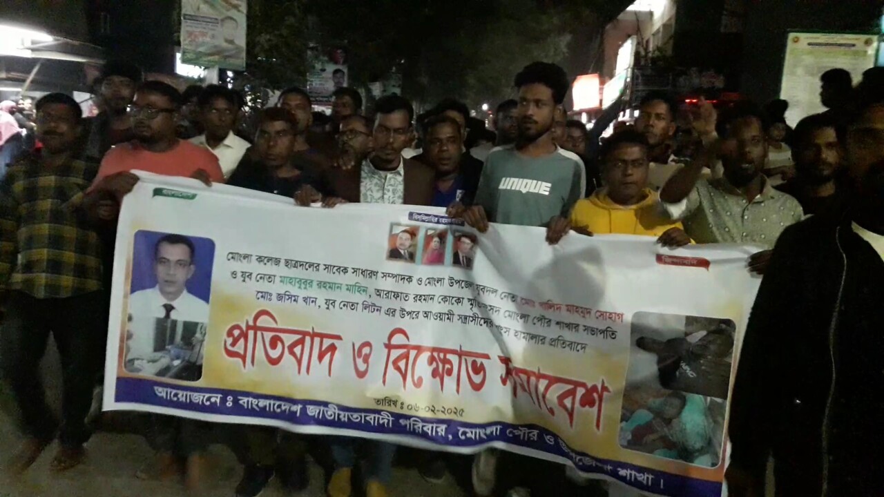 তরিকুল মোল্লা ; বাগেরহাটের মোংলায় মোংলা সরকারি কলেজ ছাত্র দলের সাবেক সাধারণ সম্পাদক খালিদ মাহমুদ সোহাগ'সহ ৩ জনকে কুপিয় জখম করার অভিযোগ উঠেছে আওয়ামী সমর্থকদের বিরুদ্ধে বৃহস্পতিবার (৬ ফেব্রুয়ারি) সন্ধ্যায় এ ঘটনার প্রতিবাদে বাগেরহাটের মোংলা পৌর ও মোংলা উপজেলা শাখার আয়োজনে প্রতিবাদ ও বিক্ষোভ সমাবেশ করেছে বাংলাদেশ জাতীয়তাবাদী পরিবার। এসময় তারা পৌর সহরের বিভিন্ন সড়ক প্রদক্ষিণ করে পৌর মার্কেটের সামনে বিক্ষোভ সমাবেশ করেন। বিক্ষোভ সমাবেশে বক্তারা বলেন, স্থানীয় আওয়ামীলীগের একটি সন্ত্রাসী গ্রুপ প্রত্যক্ষ ও পরোক্ষভাবে মোংলা কলেজ ছাত্রদলের সাবেক সাধারণ সম্পাদক ও মোংলা উপজেলা যুবদল নেতা মোঃ খালিদ মাহমুদ সোহাগ, যুব নেতা মাহাবুবুর রহমান মাহিন, আরাফাত রহমান কোকো স্মৃতি সংসদ মোংলা পৌর শাখার সভাপতি মোঃ জসিম খান ও যুব নেতা লিটনকে কুপিয়ে গুরুতর জখম করে।