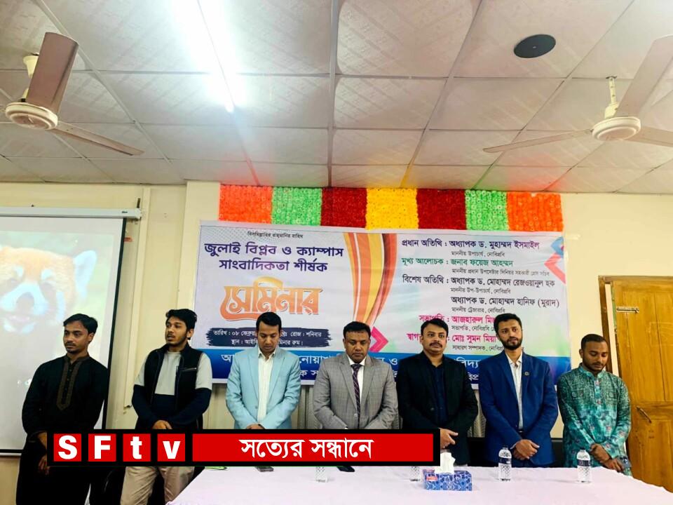 নোয়াখালী বিজ্ঞান ও প্রযুক্তি বিশ্ববিদ্যালয়ের (নোবিপ্রবি) প্রেসক্লাবের আয়োজনে জুলাই বিপ্লব ও ক্যাম্পাস সাংবাদিকতা শীর্ষক সেমিনার অনুষ্ঠিত হয়েছে। আজ শনিবার (০৮ ফেব্রুয়ারি ২০২৫) নোবিপ্রবি ইনস্টিটিউশনাল কোয়ালিটি অ্যাসুরেন্স সেলের (আইকিউএসি) কনফারেন্স রুমে অনুষ্ঠিত এ সেমিনারে প্রধান অতিথি ছিলেন বিশ্ববিদ্যালয়ের মাননীয় উপাচার্য অধ্যাপক ড. মুহাম্মদ ইসমাইল। নোবিপ্রবি প্রেসক্লাবের সভাপতি আজহারুল মিজানের সভাপতিত্বে সেমিনারে মূখ্য আলোচক ছিলেন মাননীয় প্রধান উপদেষ্টার সিনিয়র সহকারী প্রেস সচিব জনাব ফয়েজ আহম্মদ।