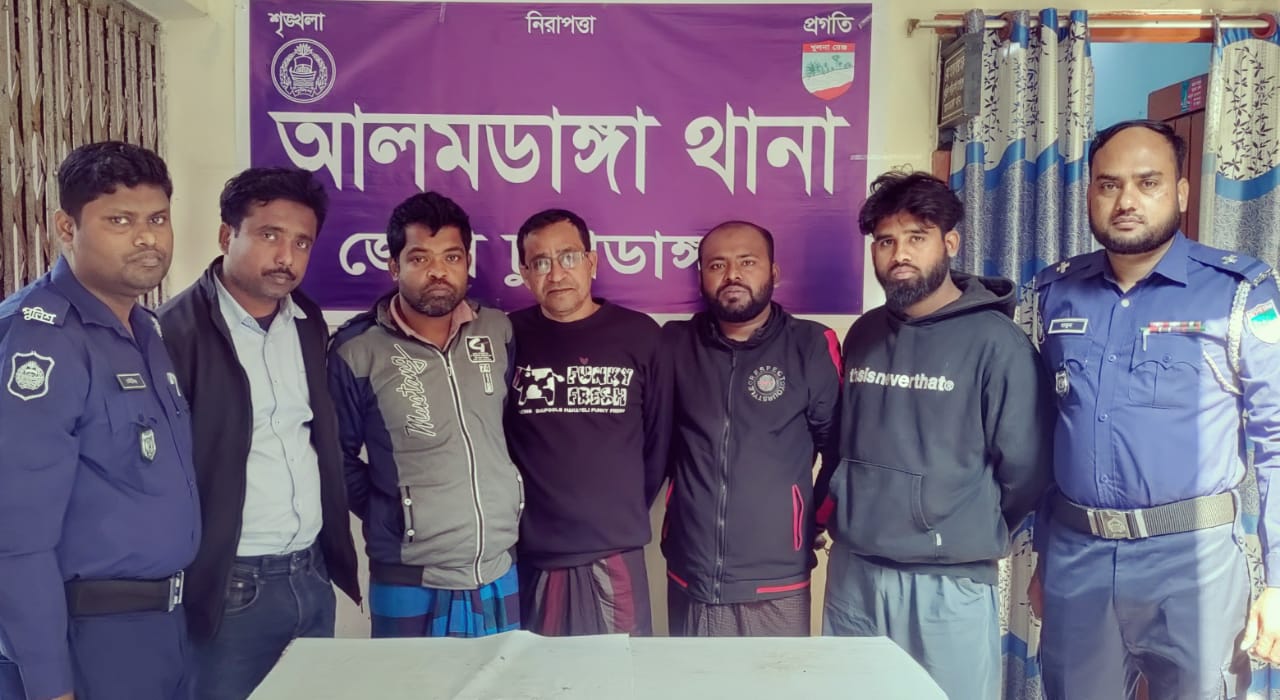 আলমডাঙ্গা থানার অফিসার ইনচার্জ মুঃ মাসুদুর রহমান এর নেতৃত্বে এসআই(নিঃ) মোঃ ওয়াহিদুল ইসলাম সঙ্গীয় অফিসার ফোর্সসহ থানা এলাকায় বিশেষ অভিযান পরিচালনাকালে গোপন সংবাদের ভিত্তিতে বিস্ফোরক মামলার আসামি মোঃ মকবুল হোসেন ছেলে বাড়াদী ইউ.পি আওয়ামীলীগ এর সাংগঠনিক সম্পাদক ১। মোঃ শামসুজ্জামান (৪০),নারায়ণপুর গ্রামের মৃত বিশারত আলীর ছেলে জামজামি ইউ.পি এর ০৬নং ওয়ার্ড যুবলীগ সেক্রেটারী ২। মোঃ জামিরুল ইসলাম (৩৫),ভাংবাড়িয়ার মোঃ ইখতার আলী মন্ডলের ছেলে ভাংবাড়ীয়া ইউ.পি যুবলীগ এর সভাপতি ৩। মোঃ রেজাউল করিম (৩৭), মোঃ ওহিদুল ইসলামের ছেলে বাড়াদী ইউ.পি ছাত্রলীগ এর সক্রিয় সদস্য ৪। মোঃ সাকিব হাসান(২৩), মাঝেরপাড়ার মোঃ ফজলুল হকের ছেলে বাড়াদী ইউ.পি ০৯নং ওয়ার্ড এর ছাত্রলীগ সভাপতি ৫। মোঃ মিল্টন আলী রিন্টু(২৬) কে গ্রেফতার করিয়া বিজ্ঞ আদালতে প্রেরণ করা হয়েছে।