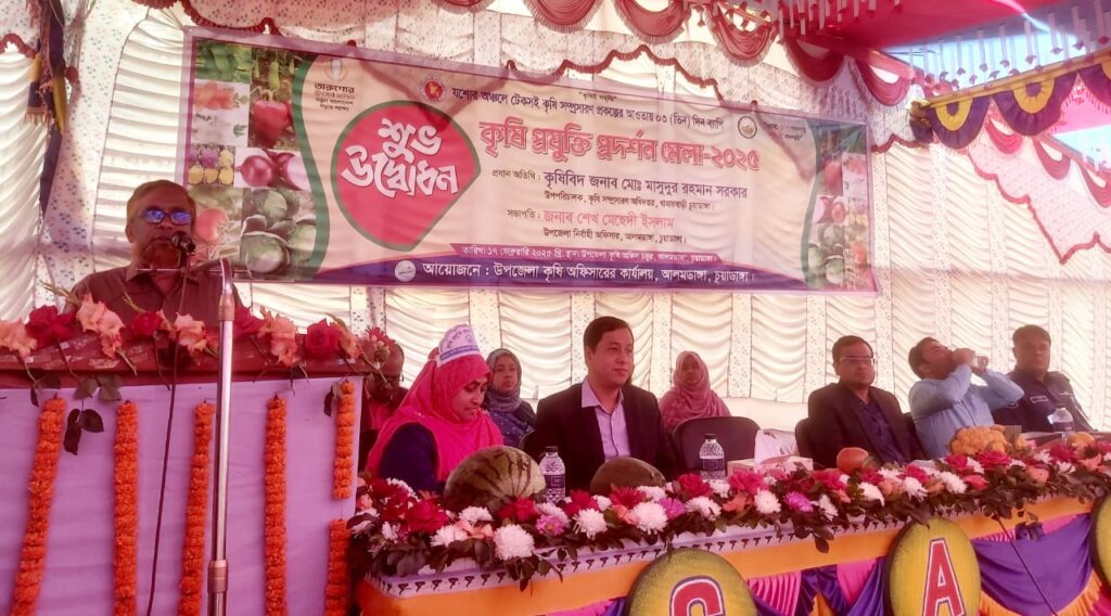 আলমডাঙ্গায় তিন দিনব্যাপী (২০২৫) কৃষি প্রযুক্তি প্রদর্শন মেলার উদ্বোধন করা হয়েছে। গতকাল সোমবার সকাল ১০ টায় কৃষি মেলার উদ্বোধন উপলক্ষে এক বর্ণাঢ্য র্যালি শেষে উপজেলা কৃষি অফিস চত্বরে বেলুন উড়িয়ে ও ফিতা কেটে মেলার শুভ উদ্বোধন করেন প্রধান অতিথি জেলা কৃষি সম্প্রসারণ অধিদপ্তরের উপ-পরিচালক কৃষিবিদ মাসুদুর রহমান সরকার। মেলার উদ্বোধনী সভায় সভাপতিত্ব করেন উপজেলা নির্বাহী অফিসার মেহেদী ইসলাম। যশোর অঞ্চলে টেকসই কৃষি সম্প্রসারণ প্রকল্পের আওতায় আলমডাঙ্গা উপজেলা কৃষি সম্প্রসারণ অধিদপ্তরের আয়োজনে এ মেলায় পারিবারিক পুষ্টি বাগান,ভার্মি কম্পোস্ট উৎপাদন,খামার যন্ত্রপাতি,ধানের আধুনিক জাত ও কৃষি পণ্য প্রক্রিয়াজাতসহ সরকারি-বেসরকারি প্রতিষ্ঠানের প্রায় ১৩টি স্টল কৃষি প্রযুক্তি প্রদর্শনীতে অংশগ্রহণ করে। যা আগামী ১৯ ফেব্রুয়ারি পর্যন্ত চলবে। বিশেষ অতিথি হিসেবে উপস্থিত ছিলেন সহকারি কমিশনার (ভূমি) আশীষ কুমার বসু, থানা অফিসার ইনচার্জ মাসুদুর রহমান, জেলা প্রশিক্ষণ অফিসার কৃষ্ণ রায়। স্বাগত বক্তব্য রাখেন উপজেলা কৃষি অফিসার কৃষিবিদ রেহানা পারভীন। উপজেলা কৃষি সম্প্রসারণ অফিসার কৃষিবিদ সাইফুল্লাহ মাহমুদের সঞ্চালনায় বক্তব্য রাখেন উপসহকারী কৃষি কর্মকর্তা আহসানুল উল হক, উপসহকারী কৃষি অফিসার মোসলে উদ্দিন, জিনারুল ইসলাম, আল হেলাল উদ্দিন, জাহিদুল ইসলাম, আশরাফুল আলম,আব্দুর রফিক, শারমিন আক্তার, কৃষকদের পক্ষে আহসানুল হক, জাহিদুল ইসলাম,কৃষানী মনিরা খাতুন। অনুষ্ঠানে উপস্থিত ছিলেন বিভিন্ন সরকারি, বেসরকারি কর্মকর্তা-কর্মচারী ও সাধারণ কৃষকরা। উদ্বোধন শেষে প্রধান অতিথি সকলকে সাথে নিয়ে মেলার বিভিন্ন স্টল ঘুরে দেখেন এবং কৃষকদের সঙ্গে কথা বলেন।
