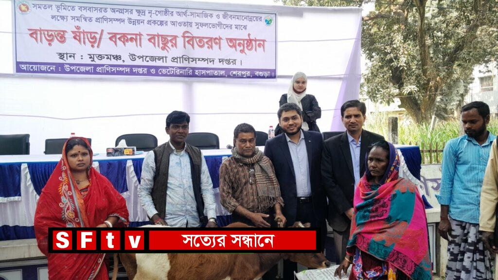 সমতল ভূমিতে বসবাসরত অনগ্রসর ক্ষুদ্র নৃ-গোষ্ঠীর সামাজিক ও জীবন মানোন্নয়নের লক্ষ্যে সমন্বিত প্রাণিসম্পদ উন্নয়ন প্রকল্পের আওতায় ও উপজেলা প্রাণীসম্পদ দপ্তর ও ভেটেরিনারি হাসপাতাল শেরপুর বগুড়া’র আয়োজনে সুফলভোগীদের মাঝে বাড়ন্ত ষাঁড় ও বকনা বাছুর গরু সহ ১০০ কেজি করে দানাদার বিতরণ করা হয়েছে।