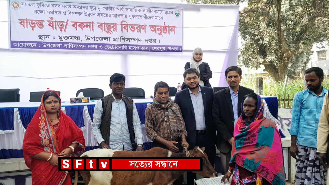 বগুড়া শেরপুরে ক্ষুদ্র নৃ-গোষ্ঠী পরিবারের মাঝে বাড়ন্ত ষাঁড় ও বকনা বাছুর গরু বিতরণ