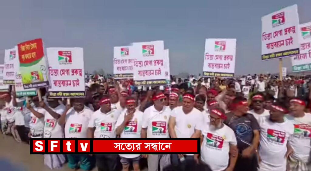 তিস্তার হাঁটুপানিতে নেমে ভারতের বিরুদ্ধে প্রতিবাদ
