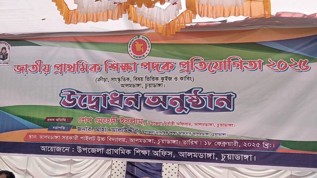আলমডাঙ্গায় জাতীয় প্রাথমিক শিক্ষা পদক প্রতিযোগিতা পুরস্কার বিতরণী অনুষ্ঠানে জেলা প্রাথমিক শিক্ষা অফিসার অহীন্দ্র কুমার মন্ডল।লেখাপড়ার পাশাপাশি খেলাধূলা শরীর ও মন ভালো রাখে। এর কোনো বিকল্প নাই।তারুণ্যের উৎসব ২০২৫,নতুন বাংলাদেশ গড়ার লক্ষ্যে স্লোগানকে সামনে নিয়ে ১৮ ই ফেব্রুয়ারী মঙ্গলবার সকাল সাড়ে ৯ টার দিকে পুরস্কার ও সনদপত্র বিতরণ অনুষ্ঠানের শুভ উদ্বোধন করেন আলমডাঙ্গা উপজেলা নির্বাহী অফিসার শেখ মেহেদী ইসলাম। অনুষ্ঠানের শুরুতে আসন গ্রহণ,ফুলেল তোড়া প্রদান,কোরআন তেলোয়াত, গীতা পাঠ, জাতীয় সংগীতের তালে তালে জাতীয় পতাকা উত্তোলন, ক্রীড়া শপথ পাঠ।অতপর শুরু হয় বিভিন্ন ইভেন্টের প্রতিযোগিতা। দৌড়, ভারসাম্য দৌড়, বিস্কুট দৌড়, হাইজাম্প,লংজাম্প,চিত্রাংকন,আবৃত্তি,একক অভিনয়,গান,নৃত্য, যেমন খুশি তেমন সাজসহ বেশকিছু ইভেন্টে প্রতিযোগিতা করে ১ম,২য় ও ৩য় স্থান অধিকারীদের ২ টার দিকে আলোচনা শেষে পুরস্কার ও সনদ বিতরণ অনুষ্ঠিত হয়েছে। উক্ত অনুষ্ঠানে স্বাগত বক্তব্য রাখেন আলমডাঙ্গা উপজেলা প্রাথমিক শিক্ষা অফিসার মোহাঃ আলাউদ্দীন। আলমডাঙ্গা সরকারি পাইলট উচ্চ বিদ্যালয় প্রাঙ্গণে ও উপজেলা সহকারী শিক্ষা অফিসার জি,এম কামাল হোসেনের উপস্থাপনায় প্রধান অতিথি হিসেবে উপস্থিত ছিলেন চুয়াডাঙ্গা জেলা প্রাথমিক শিক্ষা অফিসার অহীন্দ্র কুমার মন্ডল। তিনি বলেন শিক্ষার পাশাপাশি খেলাধূলা অঙ্গাঙ্গীভাবে জড়িত। খেলাধূলা করলে শরীর ও মন সুস্থ আর ভালো রাখে। তোমরা আজ উপজেলা পর্যায়ে অংশ নিয়ে বিজয়ীরা জেলা পর্যায়ে খেলার যোগ্যতা অর্জন করলে তাদেরকে অভিনন্দন। আর যারা বিজিত হয়েছো তাদের জন্য শুভকামনা রইল। আগামীতে আরো ভালো করার চেষ্টা করবে।তিনি আরো বলেন এত সুন্দর একটা অনুষ্ঠানের যারা আয়োজক তাদেরকে ও অসংখ্য ধন্যবাদ। আলমডাঙ্গা উপজেলা প্রাথমিক শিক্ষা অফিসের আয়োজনে পুরস্কার বিতরণী অনুষ্ঠানে সম্মানিত অতিথি হিসেবে উপস্থিত ছিলেন কমলাপুর পিটিআই’র সুপারিনটেন্ড ফনিভূষন রায়,কুষ্টিয়া জেলা প্রাথমিক শিক্ষা অফিসার মোস্তাফিজুর রহমান, ইউআরসি ইন্সট্রাক্টর জামাল হোসেন, সরকারি পাইলট মাধ্যমিক বিদ্যালয়ের প্রধান শিক্ষক গিয়াস উদ্দিন,চুয়াডাঙ্গা জেলা প্রাথমিক শিক্ষক সমিতির সাধারণ সম্পাদক ও আলমডাঙ্গা আদর্শ সরকারি প্রাথমিক বিদ্যালয়ের প্রধান শিক্ষক নাসির উদ্দীন, আজমপুর সরকারি প্রাথমিক বিদ্যালয়ের অবঃ প্রধান শিক্ষক গন্জের আলী।সার্বিক সহযোগিতা করেন আলমডাঙ্গা উপজেলা সহকারী শিক্ষা অফিসার শামীম সুলতান, হুমায়ূন কবির, রফিকুল ইসলাম, বখতিয়ার উদ্দিন।সহয়তা করেন প্রধান শিক্ষক হারেস উদ্দিন, আমিনুল ইসলাম, জহুরুল হক,হাসান সাজিদ হাবিব, তৌহিদুল হক,তবিবুর রহমান, জামিরু