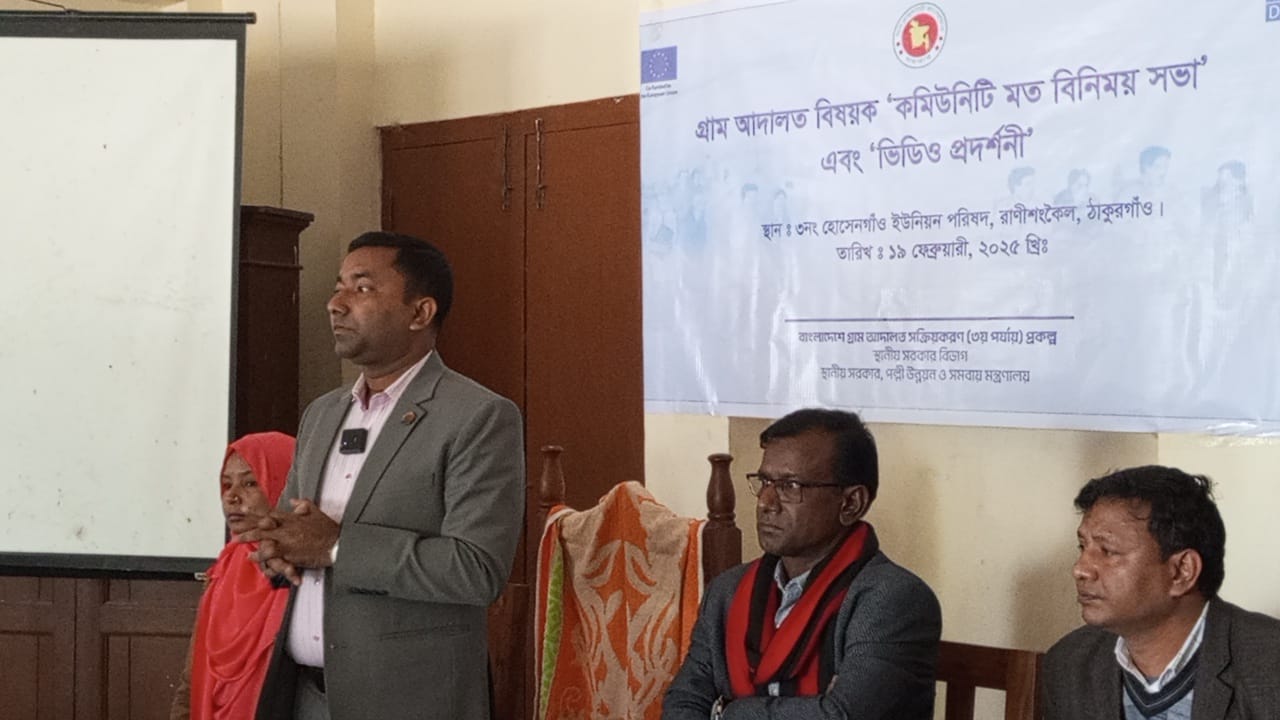 আব্দুল জব্বার(রাণীশংকৈল ঠাকুরগাঁও)প্রতিনিধি: সারা বাংলাদেশের ন্যায় ঠাকুরগাঁওয়ের রাণীশংকৈল উপজেলার ৩ নং হোসেনগাঁও ইউনিয়নে গ্রাম আদালত সম্পর্কে দক্ষ এবং জ্ঞান বৃদ্ধির জন্য ইউনিয়ন পর্যায়ে "গ্রাম আদালত বিষয়ক "কমিউনিটি মতবিনিময় সভা ও ভিডিও শো আজ সকাল ১১ঘটিকায় পরিষদের শোভাকক্ষে অনুষ্ঠিত হয়।উক্ত অনুষ্ঠানে সভাপতিত্ব করেন মতিউর রহমান (মতি) , চেয়ারম্যান, ৩ নং হোসেনগাঁও ইউনিয়ন পরিষদ। প্রধান অতিথি হিসেবে উপস্থিত ছিলেন উপজেলা নির্বাহী কর্মকর্তা রকিবুল হাসান। আরও উপস্থিত ছিলেন ইউনিয়ন পরিষদের সকল সদস্যবৃন্দ, শিক্ষক, চাকুরীজীবি, ব্যবসায়ী, সাংবাদিক, এনজিও প্রতিনিধিসহ স্থানীয় ব্যক্তিবর্গ। সভায় গ্রাম আদালত সম্পর্কে একটি পাওয়ার পয়েন্ট প্রেজেন্টেশন উপহার দেন। প্রেজেন্টেশন এর পর গ্রাম আদালত সম্পর্কে বিভিন্ন বিষয়ে আলোচনায় অংশগ্রহণ করেন উপস্থিত ব্যক্তিবর্গ। অনুষ্ঠানটি উপস্থাপনা করেন উপজেলা সমন্বয়কারী রাশেদা আক্তার। চেয়ারম্যান তার বক্তব্যে বলেন, আমরা গ্রাম আদালত'র ধারা এবং বিধি মোতাবেক বিচার কার্য সম্পাদন করি এবং মামলা দায়েরের ক্ষেত্রে সকলের সহযোগিতা কামনা করেন এবং মামলা নিষ্পত্তিতে সর্বোচ্চ নিরপেক্ষতা বজায় রাখা হবে বলে জানান। পরিশেষে চমৎকার এই আয়োজনকে হোসেনগাঁও ইউনিয়ন পরিষদের পক্ষ থেকে উপস্থিত সবাইকে আন্তরিক ধন্যবাদ জ্ঞাপন করেন ।