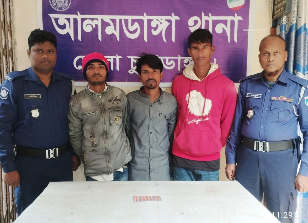 আলমডাঙ্গা থানা পুলিশের মাদকবিরোধী অভিযানে ৪০ (চল্লিশ) পিস মাদকদ্রব্য ট্যাপেন্টাডল ট্যাবলেটসহ তিনজন আসামিকে গ্রেফতার করা হয়েছে। থানার অফিসার ইনচার্জ জনাব মোঃ মাসুদুর রহমানের নেতৃত্বে এসআই (নিঃ) শংকর কুমার হীরা, মুন্সিগঞ্জ পুলিশ ক্যাম্প, আলমডাঙ্গা থানা সঙ্গীয় অফিসার ফোর্সসহ ক্যাম্প এলাকায় গ্রেফতারী পরোয়ানা তামিল ও মাদক উদ্ধার অভিযানের সময় গোপন সংবাদের ভিত্তিতে বিশেষ অভিযান পরিচালিত হয়। অভিযানকালে, ১৯ ফেব্রুয়ারি ২০২৫ তারিখ ভোর ০৫.৪৫ ঘটিকায়, আলমডাঙ্গা থানাধীন মুন্সিগঞ্জ বাজারস্থ শ্রী শ্রী হরিবাসর নাট মন্দিরের সামনে পাঁকা রাস্তার উপর হতে তিনজন মাদক ব্যবসায়ীকে হাতে নাতে গ্রেফতার করা হয়। গ্রেফতারকৃত আসামিরা হলেন: