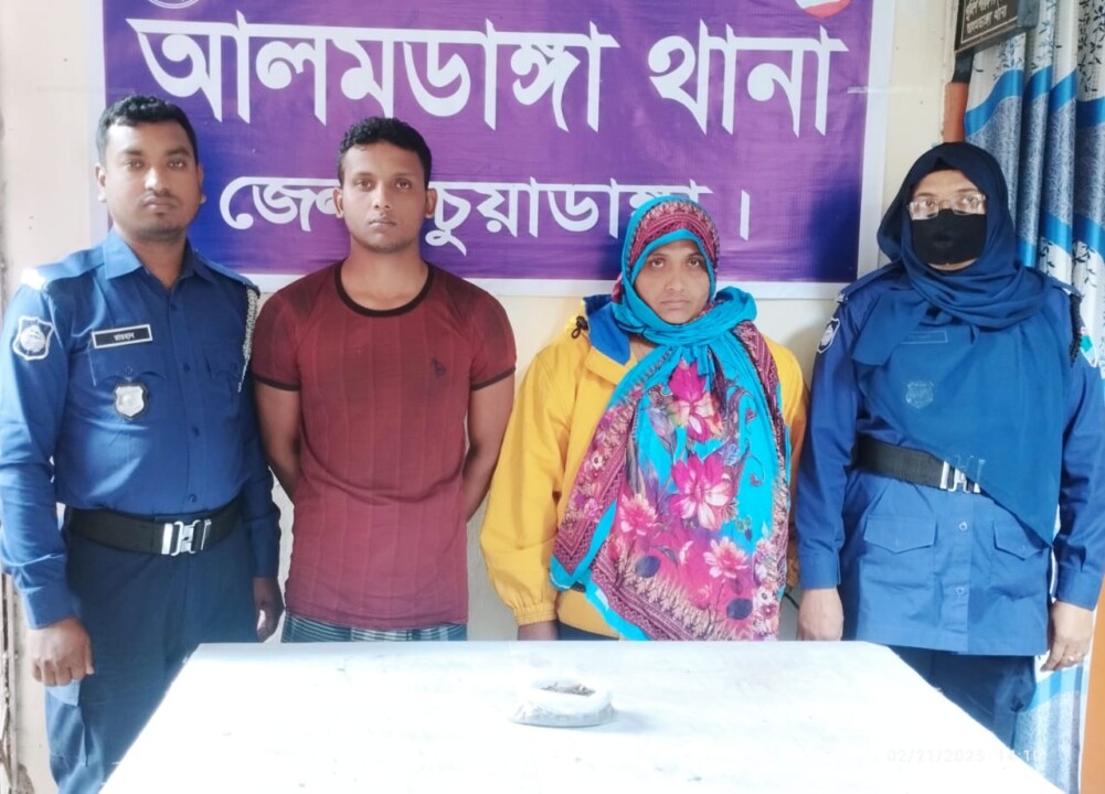 চুয়াডাঙ্গার আলমডাঙ্গা থানা পুলিশ মাদকবিরোধী বিশেষ অভিযানের অংশ হিসেবে ২১ ফেব্রুয়ারি ২০২৫ ইং তারিখ রাত ১০:৩০ ঘটিকায় গোপন সংবাদের ভিত্তিতে অভিযান চালিয়ে ১৫৫ (একশত পঞ্চান্ন) গ্রাম গাঁজাসহ দুইজন মাদক ব্যবসায়ীকে হাতে-নাতে গ্রেফতার করেছে।