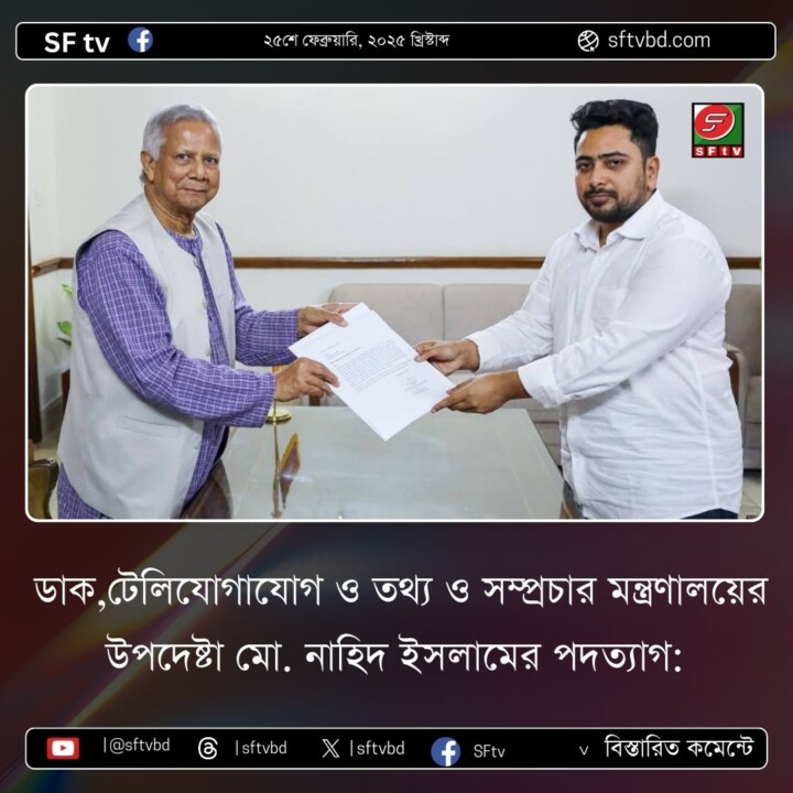 ডাক, টেলিযোগাযোগ ও তথ্যপ্রযুক্তি ও তথ্য ও সম্প্রচার মন্ত্রণালয়ের উপদেষ্টা মো. নাহিদ ইসলামের পদত্যাগ: