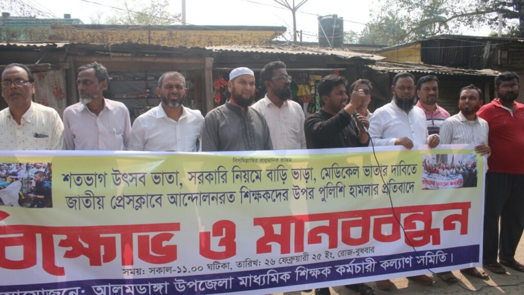বক্তারা বলেন, “শিক্ষকরা জাতি গঠনের কারিগর। কিন্তু আজ তারা ন্যায্য দাবি আদায়ে রাজপথে নেমে পুলিশের হামলার শিকার হচ্ছেন, যা অত্যন্ত নিন্দনীয় ও অমানবিক। আমরা এর তীব্র প্রতিবাদ জানাই এবং অবিলম্বে শিক্ষকদের দাবি মেনে নেওয়ার জন্য সরকারের প্রতি আহ্বান জানাই।” মানববন্ধন শেষে এক সংক্ষিপ্ত সমাবেশে বক্তারা সরকারের সংশ্লিষ্ট দপ্তরের দৃষ্টি আকর্ষণ করে বলেন, “শিক্ষকদের ন্যায্য ভাতা ও সুযোগ-সুবিধা নিশ্চিত না হলে বৃহত্তর আন্দোলন গড়ে তোলা হবে।”