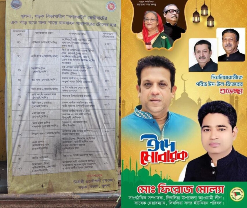সরেজমিন অনুসন্ধানে জানা যায়, বৈষম্যহীন দেশ গড়ার প্রত্যয় নিয়ে গত বছর ৫ আগষ্ট ছাত্র জনতার গণঅভ্যুত্থানে স্বৈরশাসকের বিদায় হলেও খুলনার দিঘলিয়া উপজেলা আওয়ামী লীগের সাংগঠনিক সম্পাদক শেখ পরিবারের আশীর্বাদ পুষ্ট উপজেলা আওয়ামী লীগের সাংগঠনিক সম্পাদক মোল্লা ফিরোজ হোসেনকে নিয়ম বহির্ভূতভাবে তৎকালীন সড়কের নিবার্হী প্রকৌশলী আনিসুজ্জামান মাসুদ সড়ক বিভাগ, খুলনার অধীন দিঘলিয়া-(রেলিগেট)- নগরঘাটা ফেরীর ইজারা পাইয়ে দেন। মেসার্স ফারদিন ষ্টোর বাজার নামে একটি প্রতিষ্ঠান যার প্রোপাইটর উপজেলা আওয়ামী লীগের সাংগঠনিক সম্পাদক মোঃ ফিরোজ মোল্লা। সড়ক ও জনপথ অধিদপ্তরাধীন নগরঘাটা ফেরীর পারাপারকৃত যানবাহন থেকে রশিদ ছাড়া জোরপূর্বক প্রকাশ্যে দিবালোকে টোলের নামে চাঁদা উত্তোলন অব্যাহত রেখেছেন আওয়ামীলীগ আমল থেকেই । টোলের রশিদ চাইলে হুমকি-ধামকি প্রদান করেন। ২৬ ফেব্রুয়ারি খুলনা শহর থেকে সাংবাদিকদের একটি গাড়ি পার হওয়ার সময় ফেরিতে তাদের চাহিদা মতো টাকা দিতে না চাওয়ায় বাঁক বিতণ্ডা শুরু হয় একপর্যায়ে সাংবাদিকদের জীবন নাশের হুমকি প্রদান করে।