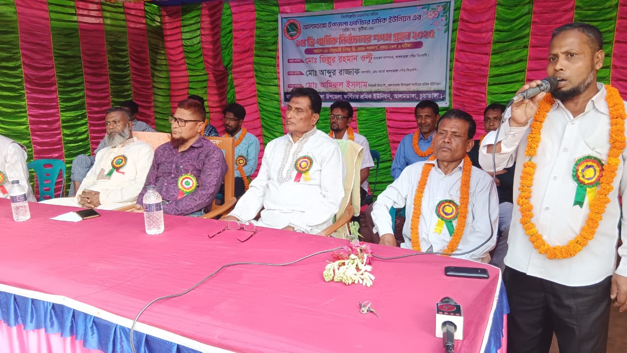 আলমডাঙ্গা উপজেলা ফার্নিচার শ্রমিক ইউনিয়নের (রেজি: নং- কুষ্টিয়া-০৮) প্রথম ত্রি-বার্ষিক নির্বাচনের শপথ গ্রহণ অনুষ্ঠান আজ শুক্রবার (২৮ ফেব্রুয়ারি) বিকেল ৩টায় অনুষ্ঠিত হয়েছে। অনুষ্ঠানে প্রধান অতিথি হিসেবে উপস্থিত ছিলেন চুয়াডাঙ্গা জেলার আলমডাঙ্গা পৌর বিএনপির সাধারণ সম্পাদক মো. জিল্লুর রহমান ওল্টু। বিশেষ অতিথি হিসেবে উপস্থিত ছিলেন আলমডাঙ্গা পৌর ৬নং ওয়ার্ড বিএনপির সভাপতি মো. আব্দুর রাজ্জাক এবং নির্বাচনী উপদেষ্টা মো. আমিরুল ইসলাম। শপথ গ্রহণ অনুষ্ঠানে নির্বাচিত নেতৃবৃন্দ আনুষ্ঠানিকভাবে শপথ নেন এবং সংগঠনের উন্নয়নে ঐক্যবদ্ধভাবে কাজ করার অঙ্গীকার করেন। অতিথিরা শ্রমিকদের ন্যায্য অধিকার ও কল্যাণে সংগঠনের ভূমিকা তুলে ধরেন এবং ভবিষ্যতে তাদের উন্নয়নে সর্বাত্মক সহযোগিতার আশ্বাস দেন।