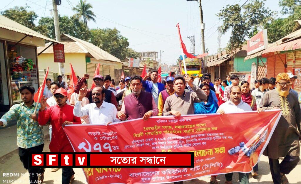মোরশেদ আলম : নেত্রকোণার দুর্গাপুরে বাংলাদেশের কমিউনিস্ট পার্টি (সিপিবি)’র ৭৭তম প্রতিষ্ঠাবার্ষিকী পালন করেছে সিপিবি দুর্গাপুর উপজেলা কমিটি। বৃহস্পতিবার (৬ মার্চ)সকাল ১১টায় কমরেড মণি সিংহ স্মৃতি জাদুঘর প্রাঙ্গণ জাতীয় পতাকা ও দলীয় পতাকা উত্তোলন, জাতীয় সংগীত ও দলের আন্তর্জাতিক সংগীত, পরে দুর্গাপুর শহরে এক বিশাল লাল পতাকার মিছিল শেষে আলোচনা সভা অনুষ্ঠিত হয়। আলোচনা সভায় বক্তারা, বৈষম্যহীন সমাজ প্রতিষ্ঠা, শোষণমুক্ত বিশ্ব গঠন এবং বিপ্লবী গণতান্ত্রিক পরিবর্তনের প্রয়োজনীয়তার ওপর গুরুত্বারোপ করেন। তাঁরা যুদ্ধবিরোধী আন্দোলন জোরদার করা, দ্রব্যমূল্যের ঊর্ধ্বগতি রোধ, চাঁদাবাজি ও দুর্নীতি বন্ধ এবং জনগণের নিরাপত্তা নিশ্চিত করার দাবি জানান। এছাড়া, তারা সংসদ নির্বাচনের সুনির্দিষ্ট তারিখ ঘোষণার আহ্বান জানান। আলোচনা সভার আগে একটি লাল পতাকার মিছিল বের করা হয়, যেখানে স্থানীয় সিপিবি নেতাকর্মীরা ছাড়াও সাধারণ জনগণ অংশগ্রহণ করেন। মিছিলটি দুর্গাপুরের প্রধান সড়ক প্রদক্ষিণ করে কমরেড মণি সিংহ স্মৃতি জাদুঘরের সামনে এসে শেষ হয়। ঐতিহ্য ও ভবিষ্যৎ পরিকল্পনা বাংলাদেশের কমিউনিস্ট পার্টি ১৯৪৮ সালে প্রতিষ্ঠিত হয় এবং সেই থেকে এটি শ্রমিক শ্রেণির অধিকার, গণতান্ত্রিক আন্দোলন এবং সমাজতান্ত্রিক রূপান্তরের জন্য কাজ করে আসছে। এবারের প্রতিষ্ঠাবার্ষিকী উপলক্ষে দলের নেতারা ভবিষ্যতে শ্রমজীবী মানুষের অধিকার প্রতিষ্ঠার লড়াইকে আরও বেগবান করার অঙ্গীকার ব্যক্ত করেন। উপজেলা কমিটির সভাপতি আলকাস উদ্দিন মীরের সভাপতিত্বে সাধারণ সম্পাদক রুপন কুমার সরকারের সঞ্চালনায়, আলোচনা করেন সিপিবি দুর্গাপুর উপজেলা কমিটির সহকারী সাধারণ সম্পাদক মোরশেদ আলম, উপজেলা উদীচী শিল্পীগোষ্ঠীর সভাপতি শামসুল আলম খান, বীর মুক্তিযোদ্ধা আব্দুল খালেক, আদিবাসী নেত্রী পার্বতী রিচিল, উপজেলা যুব ইউনিয়নের সভাপতি নজরুল ইসলাম, উপজেলা ছাত্র ইউনিয়ন সভাপতি জহির রায়হান প্রমুখ।