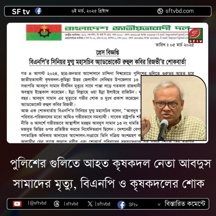 পুলিশের গুলিতে আহত কৃষকদল নেতা আবদুস সামাদের মৃত্যু, বিএনপি ও কৃষকদলের শোক প্রকাশ