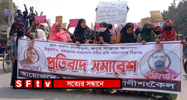 আব্দুল জব্বার : ঠাকুরগাঁওসহ দেশের বিভিন্ন স্থানে শিশু ও নারী ধর্ষণ ও নির্যাতনের প্রতিবাদে রবিবার (৯ মার্চ) দুপুরে ঠাকুরগাঁওয়ের রাণীশংকৈলে ছাত্র-জনতার উদ্যোগে এক সমাবেশ অনুষ্ঠিত হয়েছে। এদিন দুপুরে উপজেলা পরিষদ চত্বরে অনুষ্ঠিত সমাবেশে বক্তব্য দেন- উপজেলা মহিলা দলের আহ্বায়ক মনিরা বিশ্বাস ও সদস্য সচিব আনার কলি, সাবেক উপজেলা ইসলামি ছাত্র শিবির সভাপতি সাব্বির হোসেন, ছাত্রদল নেতা আরজু, প্রতিনিধি তারেক মাহমুদ প্রমুখ। এ সময় জামায়াতের সেক্রেটারি রজব আলী, উপজেলা বিএনপির সাংগঠনিক সম্পাদক বকুল মজুমদার, পৌর বিএনপির সভাপতি অধ্যাপক শাহাজাহান আলী, বিএনপির যুগ্ন সাধারণ সম্পাদক অধ্যাপক মনিরুজ্জামান মনি, বিএনপি নেতা প্রভাষক মোস্তাফিজুর রহমান, শরিফ মাস্টারসহ অনেকে উপস্থিত ছিলেন। সমাবেশে বক্তারা ঠাকুরগাঁওয়ে শিশু ধর্ষণসহ সারাদেশের নারী-শিশু নির্যাতনের বিরুদ্ধে তীব্র প্রতিবাদ জানান। সেইসাথে তারা ধর্ষক ও নির্যাতনকারিদের আইনের আওতায় এনো দ্রুত বিচার ও কঠোর শাস্তি দাবি করেন।
