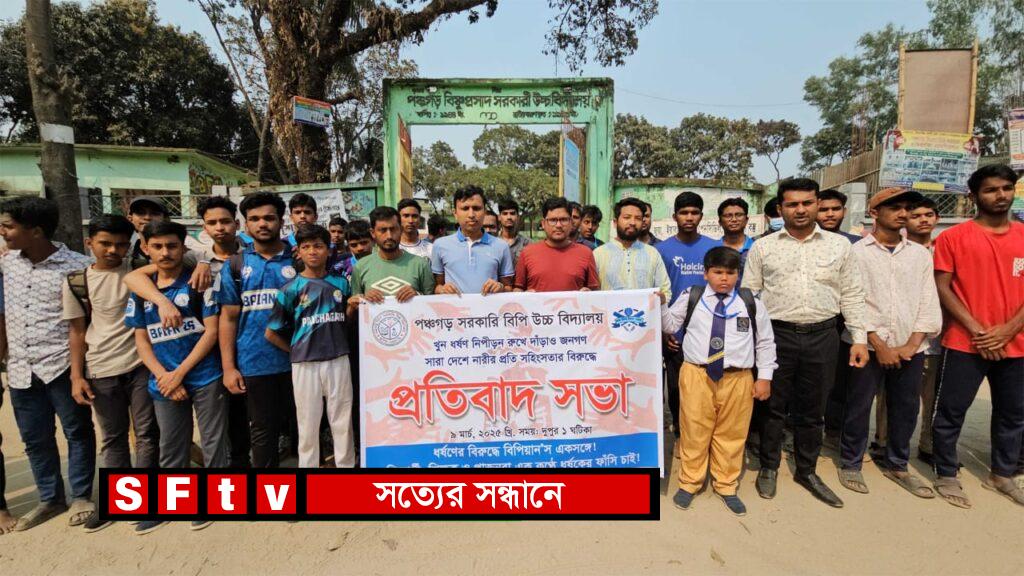 মাগুরাসহ দেশের বিভিন্ন স্থানে সাম্প্রতিক ধর্ষণের ঘটনার প্রতিবাদ ও ধর্ষকদের দৃষ্টান্তমূলক শাস্তির দাবিতে পঞ্চগড়ে বিক্ষোভ ও মানববন্ধন কর্মসূচি পালন করেছে শিক্ষক ও শিক্ষার্থীরা। রোববার (৯ মার্চ) দুপুরে পঞ্চগড় বিপি সরকারি উচ্চ বিদ্যালয়ের সামনে প্রতিষ্ঠানের শিক্ষক ও শিক্ষার্থীরা এ কর্মসূচি পালন করে। এ সময় বক্তব্য রাখেন প্রতিষ্ঠানটি সহকারী শিক্ষক জুয়েল ইসলাম, আরিফ রায়হান ও আব্দুল গফুর, বৈষম্য বিরোধী ছাত্র আন্দোলনের সমন্বয়ক ছাত্র প্রতিনিধি মোকাদ্দেসুর রহমান সান, প্রাক্তন ছাত্র তানজিরুল ইসলাম ও শিক্ষার্থী রহুল আমিন। এ সময় বক্তারা জানান, শান্তিপূর্ণ এ দেশে ধর্ষণের মতো ঘটনা দিন দিন বেড়েই চলেছে। দৃষ্টান্তমূলক শাস্তি নিশ্চিত করা না হওয়ায় দিন দিন এমন ঘটনা পুনরাবৃত্তি হচ্ছে- হবে। শিশু থেকে বৃদ্ধ কোনো নারীই এখন নিরাপদ নয়। ধর্ষকদের গ্রেফতার করে সবার সামনে ফাঁসি দেয়া গেলে এ কলঙ্ক থেকে দেশ মুক্তি পাবে বলে দাবি করেন তারা। এ সময় শিক্ষক শিক্ষার্থীরা ধর্ষকের বিচারের দাবিতে বিভিন্ন স্লোগান দেয়।
