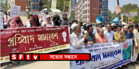 উজ্জ্বল কুমার সরকার : নওগাঁ মেডিকেল কলেজ বন্ধের সিদ্ধান্তের প্রতিবাদে বিক্ষোভ সমাবেশ করেছেন শিক্ষার্থী ও জেলার ১৮ টি সামাজিক স্থানীয় সংগঠনের ব্যনারে শনিবার (১৫ মার্চ) বেলা সাড়ে ১১টায় শহরের মুক্তির মোড়ে ‘জেলার সর্বস্তরের জনগণ ও মেডিকেল কলেজের শিক্ষার্থী’ ব্যানারে ঘণ্টাব্যাপী এ বিক্ষোভ হয়।এতে শিক্ষার্থী ও বিভিন্ন রাজনৈতিক দলের নেতৃবৃন্দসহ পাঁচ শতাধিক সাধারণ স্থানীয় জনতা অংশ নেন। এর আগে বেলা ১১টায় নওগাঁ মেডিকেল কলেজ চত্বর থেকে একটি বিক্ষোভ মিছিল নিয়ে শহরের প্রধান প্রধান সড়ক প্রদক্ষিণ শেষে মুক্তির মোড়ে সমবেত হন শিক্ষার্থী ও ইন্টার্ন চিকিৎসকরা।বিক্ষোভ সমাবেশে নওগাঁ জেলা বিএনপির সাবেক সভাপতি নজমুল হক সনি, যুগ্ম-আহ্বায়ক মামুনুর রহমান রিপন, জেলা বাসদের আহ্বায়ক জয়নাল আবেদিন মুকুল, জেলা শিবিরের সেক্রেটারি আব্দুর রাকিব, জাতীয় আগ্রাসন প্রতিরোধ মঞ্চ নওগাঁর সভাপতি কাজী মহিউদ্দিন আলমগীর, ইন্টার্ন চিকিৎসক ডা. ফারহান সাদিক রওনকসহ নওগাঁ মেডিকেল কলেজের বিভিন্ন বর্ষের শিক্ষার্থীরা বক্তব্য দেন।সমাবেশে বক্তারা বলেন, নওগাঁ মেডিকেলের শিক্ষার মান দেশের অন্য মেডিকেল কলেজগুলোর তুলনায় কোনো অংশেই কম নয়। প্রতিবছর প্রকাশিত ফলাফলে সেটি প্রমাণিত হয়েছে। এরপরেও এমন সিদ্ধান্ত নেওয়া হলে নওগাঁ থেকে সারাদেশে ধান-চাল সরবরাহ বন্ধ করে দেওয়া হবে। সরকারে থেকে এসব ষড়যন্ত্র না করে দ্রুত স্থায়ী ক্যাম্পাস নির্মাণে সংশ্লিষ্টদের এগিয়ে আসার আহ্বান জানান তারা।