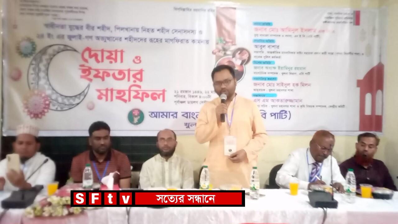 মোঃ ইমরান হোসেন : শনিবার ২২ মার্চ বিকাল ৫ টায় পূর্বাঞ্চল ডায়লগ সেন্টারে আমর বাংলাদেশ পাটি( এবি পার্টি) খুলনা মহানগর শাখার উদ্যোগে ইফতার মাহফিল অনুষ্ঠিত, স্বাধীনতা যুদ্বের বীর শহীদ, পিলখানায় নিহত শহীদ সেনা সদস্য ও ২৪ ইং এর জুলাই গন অভ্যুত্থানের শহীদের রুহের মাগফিরাত কামনা সাম্য মানবিক মর্যাদা ও সামাজিক সুবিচার প্রতিষ্ঠায় অঙ্গীকার বদ্ধ রাজনৈতিক দল এই পতিপদ্য মুল নিতি নিয়ে পথচলা আলোচনা সভার সভাপতিত্ব করেন আহ্বায়ক খুলনা মহানগর শাখা মোঃ সাইদুল হক মিলন,সঞ্চালনা করেন সদস্য সচিব খুলনা মহানগর শাখা ও কৃষি বিষয়ক সম্পাদক কেন্দ্রীয় কমিটি, প্রধান অতিথি হিসেবে উপস্থিত ছিলেন আমার বাংলা দেশ পার্টি (এবি পার্টি) যুগ্ম সম্পাদক ও সদস্য, মোঃ আমিনুল ইসলাম এফ সি এ,সম্মানিত অতিথি সভাপতি খুলনা জেলা আন্তর্জাতিক মানবাধিকার আইন সহায়তা প্রধান কারি সংস্থা, সাবেক পুলিশ কর্মকর্তা আবুল বাশার, বিশেষ অতিথি হিসেবে উপস্থিত ছিলেন অধ্যা সাংগঠনিক সম্পাদক খুলনা বিভাগ ইয়ামিনুর রহমান, আমার বাংলা দেশ পার্টির অঙ্গ সহযোগী সংগঠনের নেতা-কর্মী উপস্থিত ছিলেন,