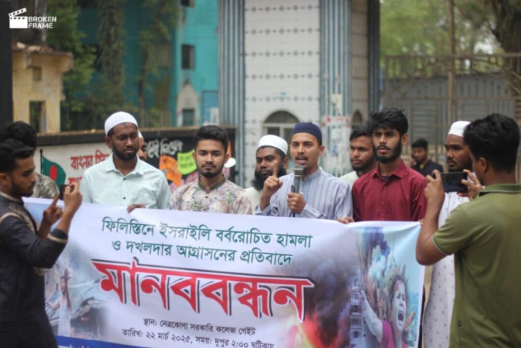 ফিলিস্তিনে ইজরায়েলের বর্বরোচিত হামলার প্রতিবাদে নেত্রকোনায় এক বিশাল মানববন্ধন অনুষ্ঠিত হয়েছে। রবিবার ২২ই মার্চ দুপুর ২ ঘটিকায় নেত্রকোনা সরকারি কলেজের ব্যানারে জেলার সর্বস্তরের সচেতন নাগরিকরা এ মানববন্ধনে অংশগ্রহণ করেন। মানববন্ধনে বক্তারা ফিলিস্তিনের জনগণের প্রতি সমর্থন জানিয়ে যুদ্ধবিধ্বস্ত এলাকায় ত্রাণ ও সহায়তা প্রেরণের আহ্বান জানান। এছাড়া মুসলিম বিশ্বকে ঐক্যবদ্ধ হয়ে ইজরায়েলের আগ্রাসনের বিরুদ্ধে কার্যকর পদক্ষেপ নেওয়ার আহ্বান জানানো হয়। এ সময় বক্তারা ইজরায়েলি পণ্য বর্জনের ওপর গুরুত্বারোপ করেন এবং জনগণকে সচেতন করতে লিফলেট বিতরণ করেন। মানববন্ধনে নেত্রকোনা সরকারি কলেজের ছাত্র-ছাত্রীদের পাশাপাশি জেলা ছাত্রশিবিরের নেতৃবৃন্দ, জাতীয় নাগরিক পার্টির কেন্দ্রীয় সদস্য ফাহিম রহমান খান পাঠান, জাতীয় নাগরিক কমিটির জেলা সংগঠক প্রকৌশলী মো. শেখ জামাল আবিরসহ বিভিন্ন রাজনৈতিক, সামাজিক ও সাংস্কৃতিক সংগঠনের নেতাকর্মীরা বক্তব্য রাখেন। বক্তারা বলেন, “ফিলিস্তিনের ওপর এই বর্বরোচিত হামলা মানবতার বিরুদ্ধে যুদ্ধ। বিশ্ব সম্প্রদায়কে এ বিষয়ে কঠোর পদক্ষেপ নিতে হবে। মানববন্ধন শেষে ইজরায়েলি পণ্য বর্জনের বিষয়ে জনগণকে উদ্বুদ্ধ করতে সচেতনতামূলক লিফলেট বিতরণ করা হয়।
