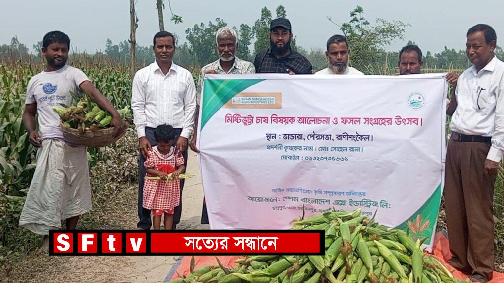 ঠাকুরগাঁওয়ের রাণীশংকৈল উপজেলার পৌর শহরের ভান্ডারা এলাকায় প্রথমবারের মতো সুইট কর্ন বা মিষ্টি ভুট্টা চাষ করে চমক দেখিয়েছেন কৃষক সোহেল রানা। সুইট কর্ন চাষে ভালো ফলন পেয়েছেন তিনি। উপজেলা কৃষি সম্প্রসারণ অধিদপ্তরের সহযোগিতায় স্পেন বাংলাদেশ এগ্রো ইন্ডাস্ট্রিজ লিমিটেড কোম্পানির তত্ত্বাবধানে পরীক্ষামূলকভাবে প্রথমবারের মতো কৃষক সোহেল রানা ১০ শতাংশ জমিতে সুইট কর্ন চাষ করেন। ইতিমধ্যে ফসল সংগ্রহ করেছেন তিনি। কৃষক সোহেল রানা বলেন, প্রথমবারের মতো ১০শতাংশ জমিতে মিষ্টি ভুট্টা চাষ করেছি। এতে ফলন হয়েছে ৩০ মন। মিষ্টি ভূট্টা চাষাবাদে সকল খরচ স্পেন বাংলাদেশ এগ্রো ইন্ডাস্ট্রিজ লিমিটেড কোম্পানি বহন করেছে। কোম্পানির প্রতিনিধিরা সরাসরি জমি থেকে কাঁচা মোচা খোসা সহ ১২ টাকা কেজি দরে ক্রয় করেন। ফলে বিক্রয়ের কোনো ঝামেলা থাকে না। এবং এর চাহিদাও রয়েছে ব্যাপক রয়েছে। স্বল্প সময়ে মিষ্টি ভুট্টা চাষে আমি লাভবান হয়েছি। আগামীতে এই চাষাবাদ আরও বৃদ্ধি করব। ঐ এলাকার কৃষক হাফিজ উদ্দিন বলেন আমরা এই ভূট্টার চাষ আগে কখনো দেখিনি স্বল্প সময়ে এত ভালো ফলন ও তুলনামূলক দামও বেশি আগামী বছর আমিও এই ভুট্টার আবাদ করব।কৃষক আব্দুল খালেক বলেন, এই ভুট্টা কাঁচা অবস্থায় খোসা সহ বিক্রয় করা হয়। এতে ওজন বেশি পাওয়া যায়। প্রতিটি গাছে দুই থেকে তিনটা মোচা ধরে। ভুট্টার ফসল আগাম সংগ্রহ করা যায় । আগামী বছর আমিও এই ভুট্টা চাষাবাদ করব। স্পেন বাংলাদেশ এগ্রো ইন্ডাস্ট্রিজ লিমিটেড মাল্টিন্যাশনাল এক্সপোর্ট কোম্পানির ফিল্ড অফিসার মির্জা আসাদুজ্জামান জানান, সুইট কর্ন আবাদে অন্য জাতের ভুট্টা তুলনায় অর্ধেক সময় লাগে আমরা সরাসরি কৃষকের জমি থেকে ভুট্টার সবুজ মোচা ১২ টাকা কেজি দরে ক্রয় করি। এটি ফ্যাক্টরিতে প্রক্রিয়াজাত করে স্পেন, চায়না, আমেরিকা সহ বিভিন্ন দেশে রপ্তানি করা হয়। কৃষক যদি ভালোভাবে পরিচর্যা করে তবে এই ভুট্টা শতকে ১৪০ থেকে ১৫০ কেজি উৎপাদন করা সম্ভব এটি একটি লাভজনক ফসল। এবং এর পুষ্টিগুণ ও চাহিদা ব্যাপক। রাণীশংকৈল উপজেলা কৃষি কর্মকর্তা কৃষিবিদ শহিদুল ইসলাম বলেন, এই প্রথম স্পেন বাংলাদেশ এগ্রো ইন্ডাস্ট্রিজ লিমিটেড কোম্পানির এর পক্ষ থেকে রাণীশংকৈল উপজেলার পৌর শহরের ভান্ডারা এলাকায় সুইট কর্ন বা মিষ্টি ভুট্টার একটি প্রদর্শনী দেয়া হয়েছিল। সুইট কর্ন একটি উচ্চ মূল্যের গুণগত মান সম্পন্ন ভুট্টার জাত। এটির ফলনও অনেক বেশি সুইট কর্ন আবাদ বৃদ্ধি করলে আমরা লাভবান হওয়ার পাশাপাশি বিভিন্ন দেশে যেমন রপ্তানি করতে পারি ও নিজেরাও খেতে পারি। এটার মধ্যে প্রচুর পুষ্টিগুণ রয়েছে। আমরা কাঁচা অবস্থায় এই ভুট্টা সংগ্রহের ফলে ভুট্টা গাছটিকে সাইলেজ করে গো-খাদ্য হিসেবে ব্যবহার করতে পা
