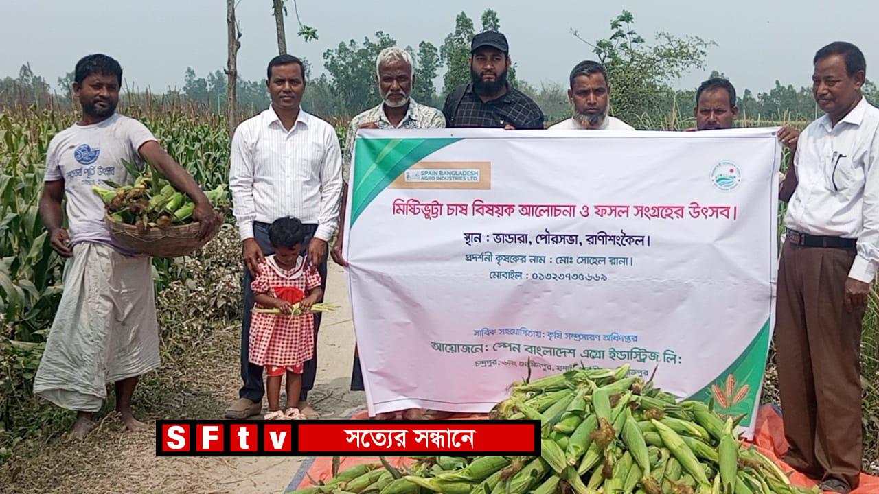 ঠাকুরগাঁওয়ের রাণীশংকৈল উপজেলার পৌর শহরের ভান্ডারা এলাকায় প্রথমবারের মতো সুইট কর্ন বা মিষ্টি ভুট্টা চাষ করে চমক দেখিয়েছেন কৃষক সোহেল রানা। সুইট কর্ন চাষে ভালো ফলন পেয়েছেন তিনি। উপজেলা কৃষি সম্প্রসারণ অধিদপ্তরের সহযোগিতায় স্পেন বাংলাদেশ এগ্রো ইন্ডাস্ট্রিজ লিমিটেড কোম্পানির তত্ত্বাবধানে পরীক্ষামূলকভাবে প্রথমবারের মতো কৃষক সোহেল রানা ১০ শতাংশ জমিতে সুইট কর্ন চাষ করেন। ইতিমধ্যে ফসল সংগ্রহ করেছেন তিনি। কৃষক সোহেল রানা বলেন, প্রথমবারের মতো ১০শতাংশ জমিতে মিষ্টি ভুট্টা চাষ করেছি। এতে ফলন হয়েছে ৩০ মন। মিষ্টি ভূট্টা চাষাবাদে সকল খরচ স্পেন বাংলাদেশ এগ্রো ইন্ডাস্ট্রিজ লিমিটেড কোম্পানি বহন করেছে। কোম্পানির প্রতিনিধিরা সরাসরি জমি থেকে কাঁচা মোচা খোসা সহ ১২ টাকা কেজি দরে ক্রয় করেন। ফলে বিক্রয়ের কোনো ঝামেলা থাকে না। এবং এর চাহিদাও রয়েছে ব্যাপক রয়েছে। স্বল্প সময়ে মিষ্টি ভুট্টা চাষে আমি লাভবান হয়েছি। আগামীতে এই চাষাবাদ আরও বৃদ্ধি করব। ঐ এলাকার কৃষক হাফিজ উদ্দিন বলেন আমরা এই ভূট্টার চাষ আগে কখনো দেখিনি স্বল্প সময়ে এত ভালো ফলন ও তুলনামূলক দামও বেশি আগামী বছর আমিও এই ভুট্টার আবাদ করব।কৃষক আব্দুল খালেক বলেন, এই ভুট্টা কাঁচা অবস্থায় খোসা সহ বিক্রয় করা হয়। এতে ওজন বেশি পাওয়া যায়। প্রতিটি গাছে দুই থেকে তিনটা মোচা ধরে। ভুট্টার ফসল আগাম সংগ্রহ করা যায় । আগামী বছর আমিও এই ভুট্টা চাষাবাদ করব। স্পেন বাংলাদেশ এগ্রো ইন্ডাস্ট্রিজ লিমিটেড মাল্টিন্যাশনাল এক্সপোর্ট কোম্পানির ফিল্ড অফিসার মির্জা আসাদুজ্জামান জানান, সুইট কর্ন আবাদে অন্য জাতের ভুট্টা তুলনায় অর্ধেক সময় লাগে আমরা সরাসরি কৃষকের জমি থেকে ভুট্টার সবুজ মোচা ১২ টাকা কেজি দরে ক্রয় করি। এটি ফ্যাক্টরিতে প্রক্রিয়াজাত করে স্পেন, চায়না, আমেরিকা সহ বিভিন্ন দেশে রপ্তানি করা হয়। কৃষক যদি ভালোভাবে পরিচর্যা করে তবে এই ভুট্টা শতকে ১৪০ থেকে ১৫০ কেজি উৎপাদন করা সম্ভব এটি একটি লাভজনক ফসল। এবং এর পুষ্টিগুণ ও চাহিদা ব্যাপক। রাণীশংকৈল উপজেলা কৃষি কর্মকর্তা কৃষিবিদ শহিদুল ইসলাম বলেন, এই প্রথম স্পেন বাংলাদেশ এগ্রো ইন্ডাস্ট্রিজ লিমিটেড কোম্পানির এর পক্ষ থেকে রাণীশংকৈল উপজেলার পৌর শহরের ভান্ডারা এলাকায় সুইট কর্ন বা মিষ্টি ভুট্টার একটি প্রদর্শনী দেয়া হয়েছিল। সুইট কর্ন একটি উচ্চ মূল্যের গুণগত মান সম্পন্ন ভুট্টার জাত। এটির ফলনও অনেক বেশি সুইট কর্ন আবাদ বৃদ্ধি করলে আমরা লাভবান হওয়ার পাশাপাশি বিভিন্ন দেশে যেমন রপ্তানি করতে পারি ও নিজেরাও খেতে পারি। এটার মধ্যে প্রচুর পুষ্টিগুণ রয়েছে। আমরা কাঁচা অবস্থায় এই ভুট্টা সংগ্রহের ফলে ভুট্টা গাছটিকে সাইলেজ করে গো-খাদ্য হিসেবে ব্যবহার করতে পা