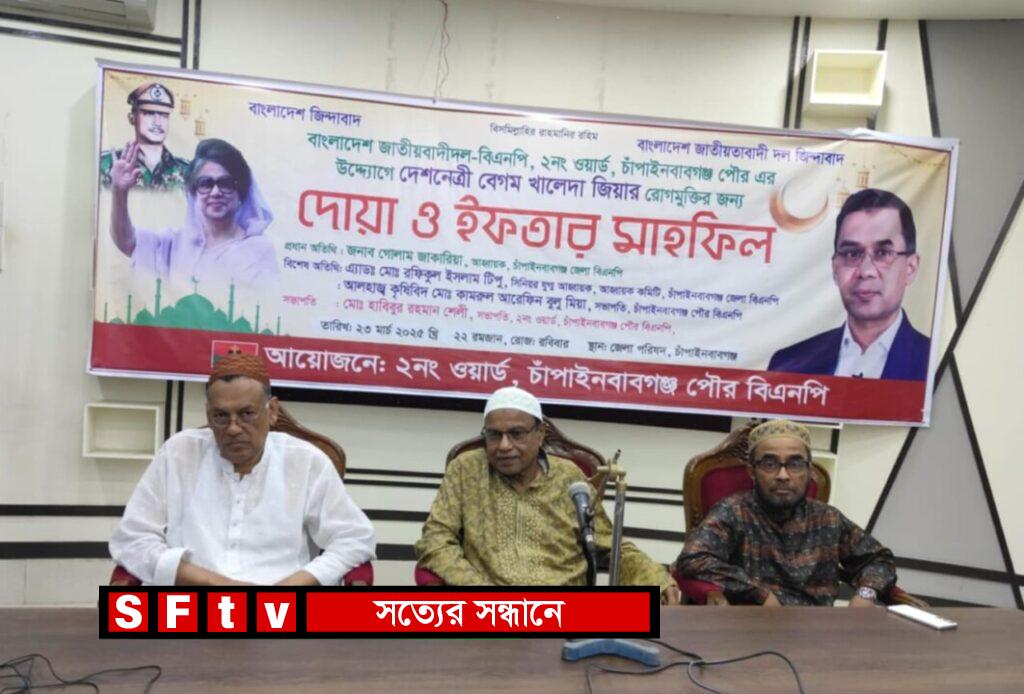 মাহিদুল ইসলাম ফরহাদ : বাংলাদেশ জাতীয়তাবাদী দল বিএনপির চেয়ারপার্সন বেগম খালেদা জিয়ার রোগ মুক্তি কামনায় বিএনপি চাঁপাইনবাবগঞ্জের পৌর ২ নং ওয়ার্ড আয়োজনে ইফতার মাহফিল অনুষ্ঠিত হয়। রবিবার (২৩ মার্চ) বিকেলে জেলা পরিষদ চত্বরে আয়োজিত ইফতার মাহফিলে সভাপতিত্ব করেন মোঃ হাবিবুর রহমান শেলী,সভাপতি ২ নং ওয়ার্ড চাঁপাইনবাবগঞ্জ পৌর বিএনপি প্রধান অতিথি ছিলেন গোলাম জাকারিয়া ,আহ্বায়ক চাঁপাইনবাবগঞ্জ জেলা বিএনপি । বিশেষ অতিথি হিসেবে বক্তব্য রাখেন এডভোকেট মোহাম্মদ রফিকুল ইসলাম টিপু ,সিনিয়র যুগ্ম আহ্বায়ক চাঁপাইনবাবগঞ্জ জেলা , আলহাজ্ব কৃষিবিদ মোঃ কামরুল আরোফিন বুলু মিয়া,সভাপতি চাঁপাইনবাবগঞ্জ পৌর বিএনপি আরো অনেকে বক্তব্য রাখেন। আলোচনা শেষে বিএনপি চেয়ারপারসন বেগম খালেদা জিয়ার রোগ মুক্তি ও দেশে জাতির মঙ্গল কামনা করে দোয়া করা হয়।