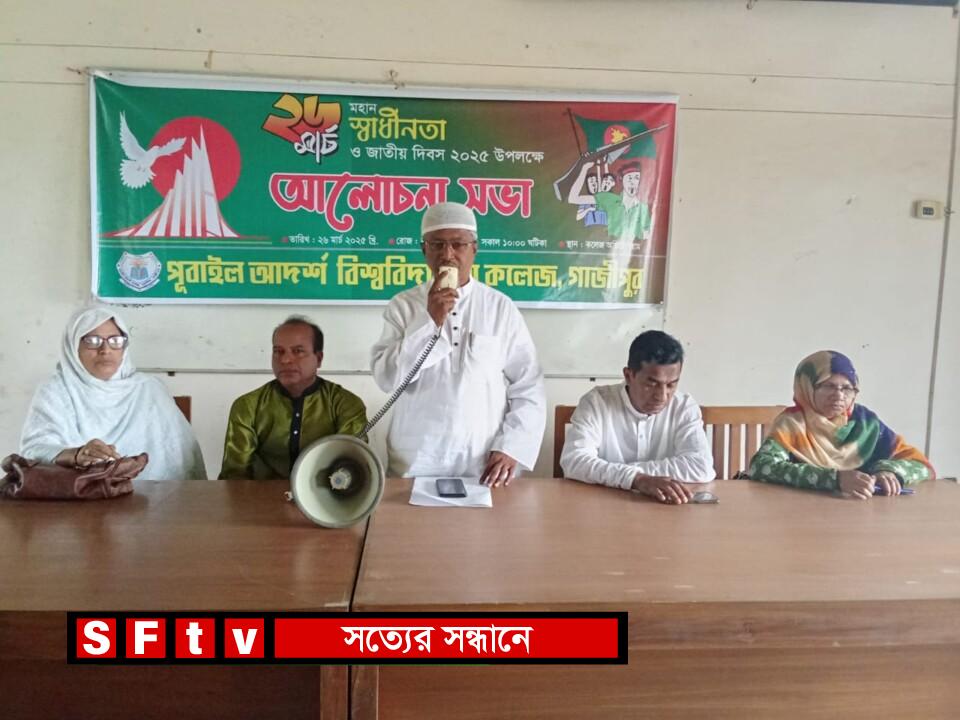 সুব্রত চন্দ্র দাস : গাজীপুরে পূবাইল আদর্শ বিশ্ববিদ্যালয় কলেজে ২৬ শে মার্চ মহান স্বাধীনতা ও জাতীয় দিবস উপলক্ষে আলোচনা সভার আয়োজন করা হয় । বুধবার (২৬ শে মার্চ ২০২৫ ইং) সকাল ১০ ঘটিকায় কলেজ অডিটোরিয়ামে উক্ত আলোচনা সভায় পূবাইল আদর্শ বিশ্ববিদ্যালয় কলেজ এর ভারপ্রাপ্ত অধ্যক্ষ মোঃ আব্দুর রশিদ এর সভাপতিত্বে এবং পূবাইল আদর্শ বিশ্ববিদ্যালয় কলেজে এর অধ্যাপিকা দৌলতেন নাহার এর সঞ্চালনায় আলোচক হিসেবে বক্তব্য রাখেন পূবাইল আদর্শ বিশ্ববিদ্যালয় কলেজ এর উপাধ্যক্ষ মোঃ আবুল হাসনাত নাইস, আরো বক্তব্য রাখেন পূবাইল আদর্শ বিশ্ববিদ্যালয় কলেজ এর এডহক কমিটির সদস্য অধ্যাপক ফাইজুল ইসলাম, অধ্যাপিকা মাহমুদা সুলতানা, অধ্যাপক মোক্তার হোসেন, অধ্যাপিকা ফারহানা আফরোজ খান, অধ্যাপক মোখলেসুর রহমান সহ প্রমুখ ।
