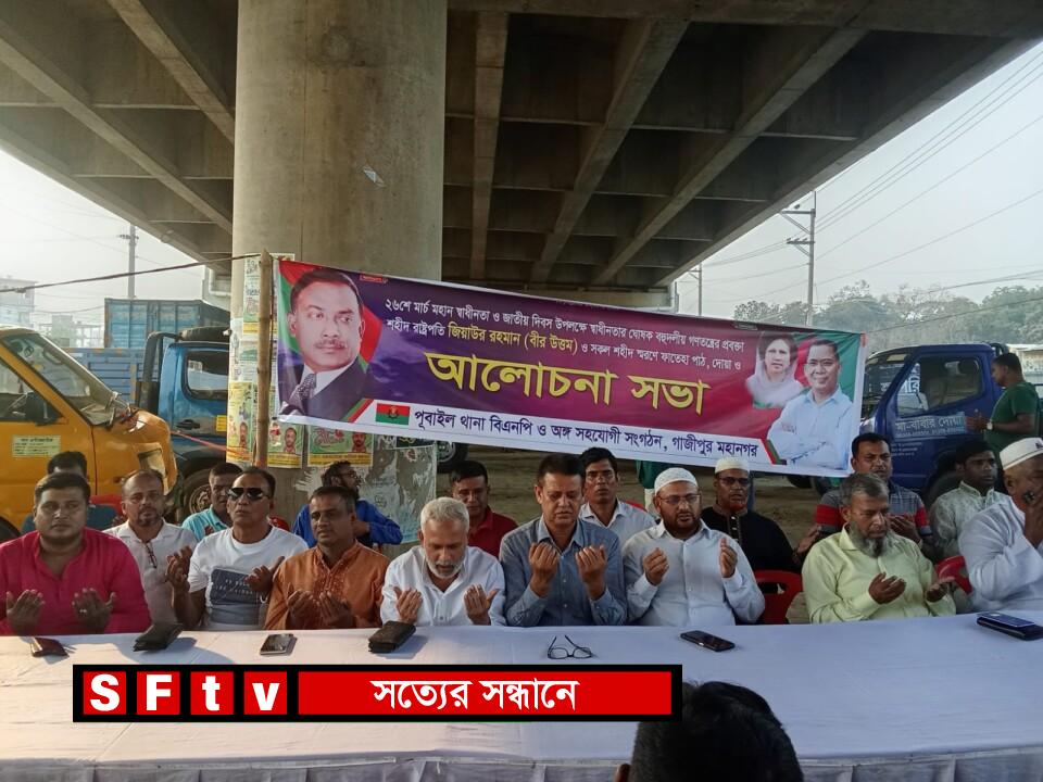 সুব্রত চন্দ্র দাস : গাজীপুরে পূবাইল থানা বিএনপি ও অঙ্গ সহযোগী সংগঠনের উদ্যোগে ২৬ শে মার্চ মহান স্বাধীনতা ও জাতীয় দিবস উপলক্ষে স্বাধীনতার ঘোষক বহুদলীয় গণতন্ত্রের প্রবক্তা শহীদ রাষ্ট্রপতি জিয়াউর রহমান (বীর উত্তম) ও সকল শহীদের স্মরণে ফাতেয়া পাঠ, দোয়া ও আলোচনা সভার আয়োজন করা হয় । বুধবার (২৬ শে মার্চ ২০২৫ ইং) দুপুর ০২ ঘটিকার সময় মীরের বাজার চৌরাস্তা এলাকায় উক্ত অনুষ্ঠানে প্রধান অতিথি হিসেবে উপস্থিত ছিলেন জনাব মনির হোসেন শিকদার বকুল, সভাপতি পূবাইল থানা বিএনপি । উক্ত অনুষ্ঠানে বিশেষ অতিথি হিসেবে উপস্থিত ছিলেন জনাব হারুন অর রশিদ সরকার, সাধারণ সম্পাদক পূবাইল থানা বিএনপি, জাকির হোসেন সরকার, সিনিয়র যুগ্মসাধারণ সম্পাদক পূবাইল থানা বিএনপি,শেখ মোঃ আমিরুল ইসলাম অফিসার ইনচার্জ পূবাইল থানা,নূর মোহাম্মদ নূরালী, সহ-সভাপতি পূবাইল থানা বিএনপি,আব্দুল আলিম, সাবেক সাধারণ সম্পাদক পূবাইল ইউনিয়ন বিএনপি, প্রভাবশালী নেতা সাখাওয়াত হোসেন খোকন, সম্মানিত সদস্য পূবাইল থানা বিএনপি, মজিবুর রহমান রাজীব, আহবায়ক পূবাইল থানা যুবদল, আরিফ হোসেন ভূঁইয়া ও নজরুল ইসলাম, সাংগঠনিক সম্পাদক পূবাইল থানা বিএনপি,রাকিব হোসেন মোল্লা, যুগ্ম সাধারণ সম্পাদক, পূবাইল থানা বিএনপি, মোঃ কামরুজ্জামান কাজল , আহবায়ক পূবাইল থানা স্বেচ্ছাসেবক দল,রাজীব ভূঁইয়া,সাবেক সহ-সভাপতি গাজীপুর মহানগর ছাত্রদল এবং সাধারণ সম্পাদক পদপ্রার্থী পূবাইল থানা যুবদল সহ আরো অসংখ্য নেতাকর্মী উপস্থিত ছিলেন ।