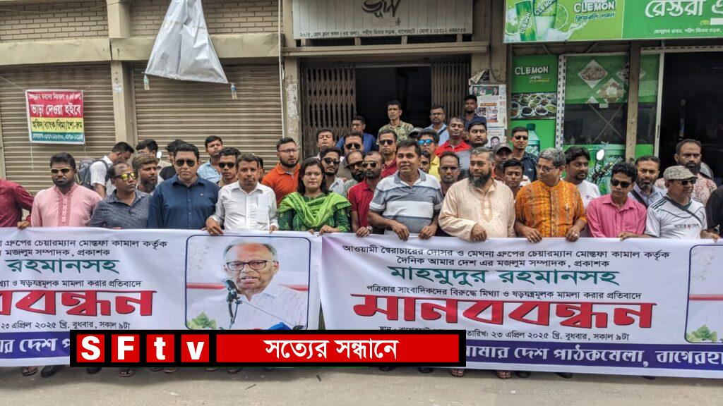 তরিকুল মোল্লা : দৈনিক আমার দেশ পত্রিকার সম্পাদক মজলুম সাংবাদিক মাহমুদুর রহমান ও অন্যান্য সাংবাদিকদের বিরুদ্ধে মামলার প্রতিবাদে মানববন্ধন ও প্রতিবাদ কর্মসূচি পালন করেছে বাগেরহাটে কর্মরত সাংবাদিক, পাঠক ও শুভানুধ্যায়ীগণ। বুধবার (২৩ এপ্রিল) সকালে বাগেরহাট প্রেসক্লাবের সামনে মানববন্ধন কর্মসূচি অনুষ্ঠিত হয়। মানববন্ধন কর্মসূচিতে বক্তারা বলেন, মাহমুদুর রহমান নির্যাতিত মজলুম লেখক তাকে নিয়ে গভীর ষড়যন্ত্র চলছে। তিনি ইসলামী মূল্যবোধের অন্যতম ধারক, আমার দেশ পত্রিকার সম্পাদক মাহমুদুর রহমানের নামে হয়রানিমূলক মামলার তীব্র প্রতিবাদ ও নিন্দা জানান। এটা শুধু একটি মিথ্যা মামলা নয় এটি ফ্যাসিস্টদের ষড়যন্ত্র মাহমুদুর রহমানের নেতৃত্বে বাংলাদেশ বহুবার ন্যায়ের পক্ষে সংঘটিত হয়েছে। বিগত আওয়ামী লীগ সরকারের আমলে দেশের বৃহৎ শিল্পগোষ্ঠী মেঘনা গ্রুপ হাজার হাজার কোটি টাকা বিদেশে পাচার করেছে। তাদের এসব অপকর্ম অনেকদিন ধরেই আড়ালে চলছিল। কিন্তু সরকারের পরিবর্তনের পর আমার দেশ পত্রিকায় এসব দুর্নীতির সংবাদ প্রকাশিত হলে মেঘনা গ্রুপের কর্তারা আতঙ্কিত হয়ে পড়ে। এরই ধারাবাহিকতায় ভারতের ‘চাপ’ এবং রাজনৈতিক উদ্দেশ্যপ্রণোদিতভাবে মেঘনা গ্রুপের চেয়ারম্যান মোস্তফা কামাল আমার দেশ পত্রিকার সম্পাদক মাহমুদুর রহমানের বিরুদ্ধে মামলা করেন। বক্তারা আরো বলেন, মাহমুদুর রহমান একজন নির্ভীক ও আপসহীন সাংবাদিক। তিনি তার পত্রিকার মাধ্যমে দীর্ঘদিন ধরে ক্ষমতাধর দুর্নীতিবাজ রাজনীতিক, আমলা ও ব্যবসায়ীদের বিরুদ্ধে সত্য প্রকাশ করে আসছেন। আজ তারই মূল্য দিতে হচ্ছে ষড়যন্ত্রের শিকার হয়ে। আমার দেশ পত্রিকার বাগেরহাট জেলা প্রতিনিধি শেখ মিরানুজ্জামান এর সঞ্চালনায় মানববন্ধনে বক্তব্য রাখেন আমার দেশ পাঠক মেলার বাগেরহাট জেলার সভাপতি সুজাউদ্দিন মোল্লা সুজন, বাগেরহাট প্রেসক্লাবের সভাপতি ও এশিয়ান টিভির জেলা প্রতিনিধি মোঃ কামরুজ্জামান, সাধারণ সম্পাদক ও এন টিভির বাগেরহাট জেলা প্রতিনিধি তরফদার রবিউল ইসলাম, বাগেরহাট প্রেসক্লাবের সহ-সভাপতি এস এম রাজ, দেশ টিভির বাগেরহাট জেলা প্রতিনিধি এস এস সোহান, মোল্লারহাট উপজেলা প্রেসক্লাবের সভাপতি এফ এম মফিজুল ইসলাম, চিতলমারি উপজেলা প্রেসক্লাবের সভাপতি ইকরামুল হক, রামপাল উপজেলা প্রেসক্লাবের সভাপতি আতিকুর রহমান। এ সময় অন্যান্যের মধ্যে চুলকাটি প্রেসক্লাবের সাংবাদিক’সহ বাগেরহাট জেলা ও বিভিন্ন উপজেলায় কর্মরত সাংবাদিকবৃন্দ উপস্থিত ছিলেন।