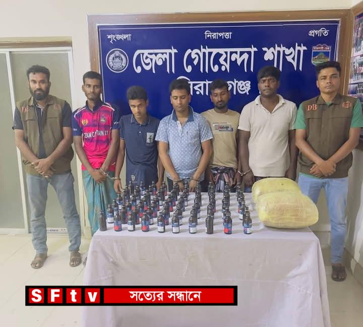 সিরাজগঞ্জ জেলা গোয়েন্দা (ডিবি) পুলিশের বিশেষ অভিযানে ১০ কেজি গাঁজা ও ৭০ বোতল ফেন্সিডিলসহ দুইটি ট্রাক এবং পাঁচজন মাদক কারবারিকে আটক করা হয়েছে। ২৫ এপ্রিল ভোরে পুলিশ সুপার মোঃ ফারুক হোসেনের দিকনির্দেশনায় ও ডিবির অফিসার ইনচার্জ মোঃ একরামুল হোসাইনের সার্বিক তত্ত্বাবধানে এসআই (নিঃ) মোঃ নাজমুল হক ও তার সঙ্গীয় ফোর্স অভিযান পরিচালনা করেন। গোপন সংবাদের ভিত্তিতে সলঙ্গা থানার কুমারগাতি এলাকার সমবায় ট্যাংক লরী ফিলিং স্টেশনের সামনে অবস্থানরত দুইটি ট্রাক থেকে মাদক উদ্ধার করা হয়। আটককৃতরা হলো: মোঃ আলামিন শেখ (৩৮), মোঃ হৃদয় (২৪), মোঃ হেলাল উদ্দিন (৩৩), মোঃ শরীফ (৩৫) ও মোঃ জাকির (১৯)। তাদের বাড়ি সিরাজগঞ্জ, কুড়িগ্রাম ও রাজশাহী জেলার বিভিন্ন এলাকায়। তল্লাশির সময় একটি ট্রাক থেকে ৭০ বোতল ফেন্সিডিল ও অন্য ট্রাক থেকে মোট ১০ কেজি গাঁজা উদ্ধার করা হয়। উদ্ধারকৃত মাদক ও ট্রাক দুটি জব্দ করা হয়েছে। আটককৃতদের বিরুদ্ধে আইনগত ব্যবস্থা গ্রহণ শেষে আদালতে প্রেরণ করা হয়েছে বলে জানিয়েছে পুলিশ।