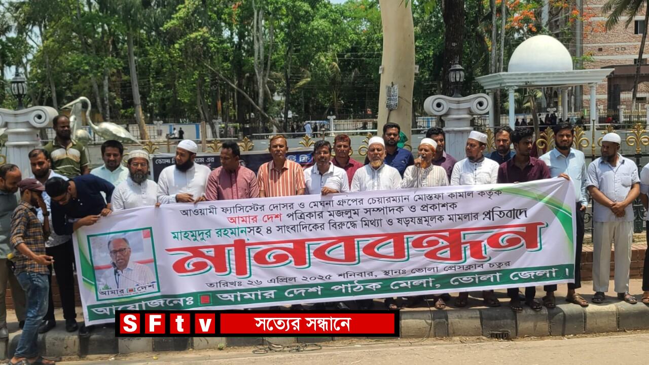 ভোলায় আমার দেশ সম্পাদক মাহমুদুর রহমানের বিরুদ্ধে মিথ্যা মামলা প্রত্যাহারের দাবিতে মানববন্ধনে ভোলা গণমাধ্যম কর্মীরা এ কথা বলেন।
