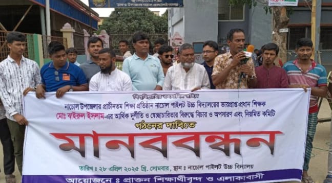 মোঃ রনি রজব ভোলাহাট সংবাদদাতা চাঁপাইনবাবগঞ্জের ; নাচোল উপজেলার ঐতিহ্যবাহী শিক্ষা প্রতিষ্ঠান নাচোল পাইলট উচ্চ বিদ্যালয়ের ভারপ্রাপ্ত প্রধান শিক্ষক মোঃ বাইরুল ইসলামের বিরুদ্ধে দুর্নীতি ও স্বেচ্ছাচারিতার অভিযোগ এনে তার অপসারনের দাবিতে মানববন্ধন কর্মসূচি পালিত হয়েছে। সোমবার (২৮ এপ্রিল) বিদ্যালয় চত্বরে এই মানববন্ধনে অংশ নেন বিদ্যালয়ের প্রাক্তন শিক্ষার্থী ও এলাকাবাসী। এ সময় বক্তারা বলেন, মোঃ বাইরুল ইসলাম বিগত ফ্যাসিস্ট সরকারের দোসর হিসেবে বিদ্যালয়টি অন্যায় ভাবে ভোগ করেছেন এবং নিজস্ব স্বার্থে প্রতিষ্ঠানের স্বাভাবিক কার্যক্রমে বাধাগ্রস্থ করেছেন। বক্তারা আরো বলেন, আর্থিক দুর্নীতি, স্বেচ্ছাচারিতা, প্রশাসনিক দুর্নীতি ও ক্ষমতার অপব্যবহার করে যাচ্ছেন। তার এসব অনিয়ম চরম পর্যায়ে পৌঁছেছে। আমরা দ্রুত ভারপ্রাপ্ত প্রধান শিক্ষকের অপসারণ দাবি করছে এবং একটি নিয়মিত ব্যবস্থাপনা কমিটি গঠনের জোর দাবি জানাচ্ছি। মানববন্ধনে বক্তব্য রাখেন, ডাঃ মোঃ মানিক হোসাইন, মোঃ নজরুল ইসলাম মাস্টার সহ স্কুলের প্রাক্তন শিক্ষার্থীরা। মানববন্ধন শেষে নাচোল উপজেলা নির্বাহী অফিসার (ইউএনও’র) কাছে একটি স্মারক লিপি প্রদান করা হয়।