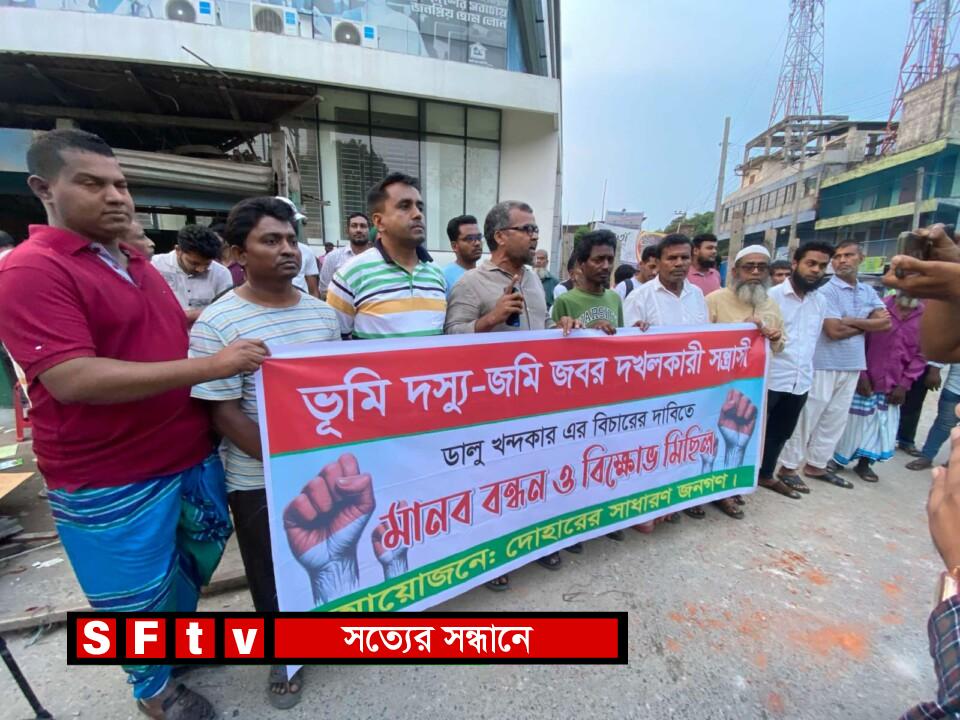 ভূক্তভোগী দোহার খালপাড় এলাকার নজরুল ইসলাম মুক্তার ও নুরুল ইসলাম মনির জানান, দোহার বাজারে তাদের ক্রযকৃত জমির উপর তিনটি দোকান তুলে ভাড়া দেন তারা। দীর্ঘদিন পর দোহার পেট্রোল পাম্পের মালিক ডালু খন্দকার জোরপূর্বক দোকানের জমি কিনে নিতে চায়। এতে রাজি না হলে মঙ্গলবার সকালে তার লোকজন দিয়ে দোকান উচ্ছেদ করে দিয়ে বালু দিয়ে ভরাটের চেষ্টা করে। এসময় দোকানের ভাড়াটিয়া মিঠু পাল বাধা দিলে তাকে মারধর করেন ডালু খন্দকার। নজরুল ইসলাম মোক্তার বলেন, আমরা জমি বিক্রি করবোনা বলার পরেও আমাদের দোকান উচ্ছেদ করা হলো, আমরা এর বিচার চাই।