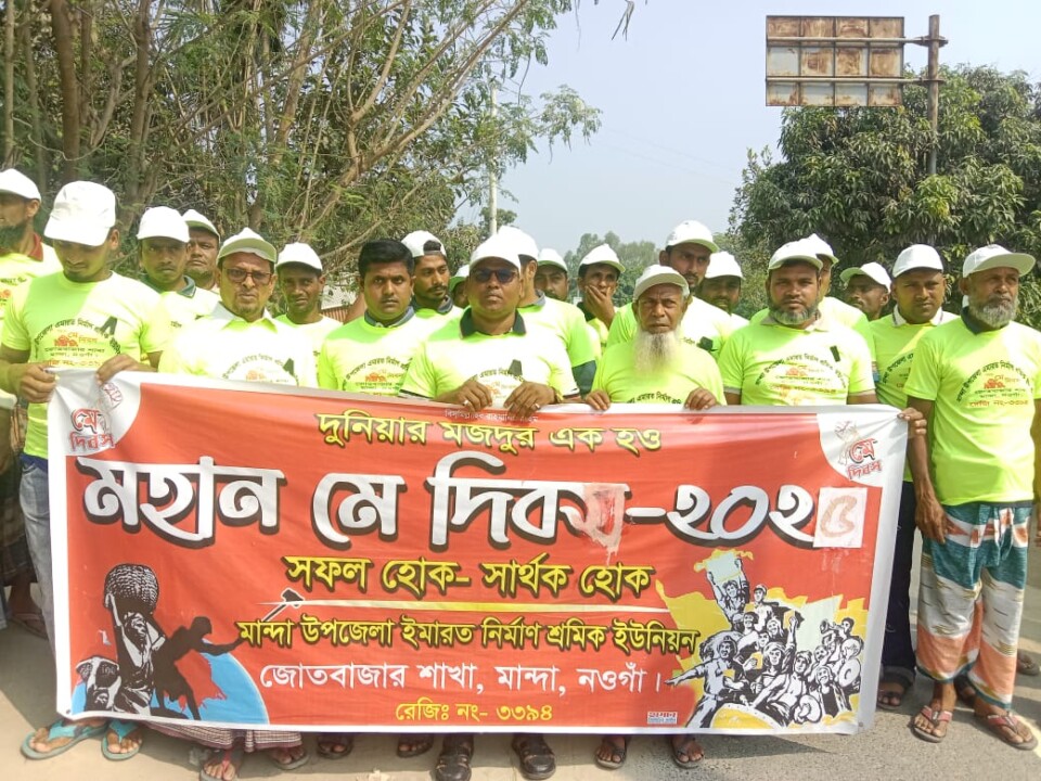 মে দিবস উপলক্ষে নওগাঁর মান্দা উপজেলায় নির্মাণ শ্রমিকদের উদ্যোগে দিনব্যাপী কর্মসূচি পালন করা হয়েছে। মঙ্গলবার (১ মে) সকালে ইরামত নির্মাণ শ্রমিক ইউনিয়ন জোতবাজার শাখার আয়োজনে জাতীয় পতাকা, সংগঠনের পতাকা ও কালো পতাকা উত্তোলনের মধ্য দিয়ে দিনের কর্মসূচির সূচনা হয়। সকাল ৮টায় পতাকা উত্তোলনের পর একটি সচেতনতামূলক র্যালি জোতবাজারের প্রধান সড়কগুলো প্রদক্ষিণ করে। পরে এক আলোচনা সভা অনুষ্ঠিত হয়। সভায় সভাপতিত্ব করেন ইউনিয়নের সভাপতি মোঃ মোকবুল হোসেন সোনার এবং সঞ্চালনা করেন সাধারণ সম্পাদক মোঃ মনিরুজ্জামান। আলোচনা সভায় প্রধান অতিথি হিসেবে উপস্থিত ছিলেন মোঃ সাদেকুল ইসলাম সাদেক, যুগ্ম আহ্বায়ক, মান্দা থানা যুবদল। বিশেষ অতিথি হিসেবে উপস্থিত ছিলেন মোঃ আহসান হাবীব বকুল, মোঃ মোজারুল ইসলাম মুকুল এবং মোঃ কামরুল ইসলাম রিপন, পরিচালক, ডাচ্ বাংলা এজেন্ট ব্যাংকিং জোতবাজার শাখা। এছাড়া মোঃ আকবর মহরীসহ ইউনিয়নের অন্যান্য সদস্য এবং স্থানীয় নির্মাণ শ্রমিকরা উপস্থিত থেকে অনুষ্ঠান সফল করেন।বক্তারা মে দিবসের তাৎপর্য ও শ্রমিকদের অধিকার বিষয়ে আলোচনা করেন এবং শ্রমজীবী মানুষের ন্যায্য মজুরি ও নিরাপদ কর্মপরিবেশ নিশ্চিতের দাবি জানান।