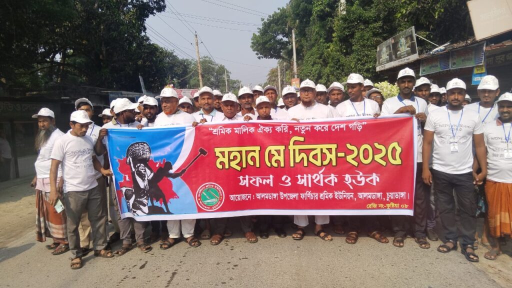 চুয়াডাঙ্গার আলমডাঙ্গায় আন্তর্জাতিক শ্রমিক দিবস উপলক্ষে ফার্নিচার শ্রমিক ইউনিয়নের উদ্যোগে বর্ণাঢ্য র্যালি ও আলোচনা সভার আয়োজন করা হয়। বৃহস্পতিবার (১ মে) সকালে উপজেলার মুক্তিযোদ্ধা মঞ্চের অস্থায়ী কার্যালয় থেকে র্যালিটি শুরু হয়। র্যালিটি শহরের গুরুত্বপূর্ণ সড়কগুলো প্রদক্ষিণ করে হাজী মোরস্থ লিয়াকত টাওয়ারে অবস্থিত লায়লা কনভেনশন হলে এসে শেষ হয়। পরে সেখানে আয়োজিত আলোচনা সভায় সভাপতিত্ব করেন ফার্নিচার শ্রমিক ইউনিয়ন সমিতির সভাপতি মো. সৌরভ উদ্দিন। কোরআন তেলাওয়াতের মাধ্যমে সভার সূচনা করেন সংগঠনের সহ-সভাপতি কামাল হোসেন। অনুষ্ঠানে উদ্বোধনী বক্তব্য দেন সংগঠনের সাংগঠনিক সম্পাদক মিনাজ উদ্দিন। সভায় প্রধান অতিথি হিসেবে উপস্থিত ছিলেন আলমডাঙ্গা থানার পরিদর্শক (তদন্ত) মো. আজগার আলী। প্রধান বক্তা হিসেবে বক্তব্য রাখেন বাংলাদেশ জাতীয়তাবাদী দলের আলমডাঙ্গা উপজেলা শাখার সভাপতি আজিজুর রহমান পিন্টু। বিশেষ অতিথিদের মধ্যে উপস্থিত ছিলেন পৌর বিএনপির সাধারণ সম্পাদক জিল্লুর রহমান অল্টো, ফার্নিচার শ্রমিক ইউনিয়নের সাধারণ সম্পাদক মো. নজরুল ইসলাম, প্রচার সম্পাদক মো. হাসিবুল ইসলাম, সাবেক কোষাধ্যক্ষ মো. ফরজ আলী এবং সংগঠনের অন্যতম সদস্য মো. কবির গোলাম আযম। সভাটি সঞ্চালনা করেন সাংবাদিক নাজমুল হক। বক্তারা মহান মে দিবসের গুরুত্ব তুলে ধরে শ্রমজীবী মানুষের অধিকার রক্ষায় সকলে সচেতন থাকার আহ্বান জানান। তারা বলেন, শ্রমিকদের ন্যায্য মজুরি, নিরাপদ কর্মপরিবেশ এবং সামাজিক নিরাপত্তা নিশ্চিত না হলে প্রকৃত উন্নয়ন সম্ভব নয়। অনুষ্ঠানে শ্রমিকদের অংশগ্রহণ ছিল উল্লেখযোগ্য এবং পরিবেশ ছিল প্রাণবন্ত।