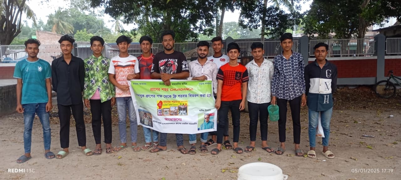 ১ মে, রবিবার মহান শ্রমিক দিবস উপলক্ষে জনপ্রিয় সামাজিক যোগাযোগ মাধ্যম ফেসবুক ভিত্তিক গ্রুপ ‘প্রাণের শহর CHUADANGA’-এর পক্ষ থেকে শ্রমজীবী মানুষদের মাঝে ফ্রি শরবত বিতরণ করা হয়েছে। এ আয়োজনটি অনুষ্ঠিত হয় চুয়াডাঙ্গা জেলার আলমডাঙ্গা উপজেলার আসমানখালী বাজারে। দিনভর বাজারে অবস্থানকারী শ্রমিক ও পথচারীদের মাঝে বিনামূল্যে ঠান্ডা শরবত বিতরণ করেন গ্রুপটির এডমিন ও মডারেটররা। এ সময় শ্রমজীবী মানুষদের সঙ্গে কুশল বিনিময়ের পাশাপাশি তাদের শ্রমের মর্যাদা ও অবদানের কথা শ্রদ্ধাভরে স্মরণ করা হয়। ‘প্রাণের শহর CHUADANGA’ ফেসবুক গ্রুপের এক এডমিন বলেন, “শ্রমিক দিবসে শ্রমজীবী ভাইদের জন্য কিছু করতে পেরে আমরা আনন্দিত। এ ধরনের সামাজিক উদ্যোগ আমাদের গ্রুপ ভবিষ্যতেও চালিয়ে যাবে।” এ আয়োজন শ্রমিকদের মাঝে আনন্দ ও উৎসাহের বার্তা পৌঁছে দিয়েছে বলে মনে করছেন স্থানীয়রা।