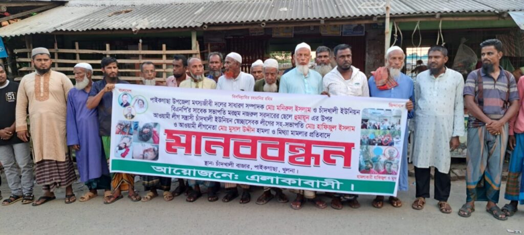 পাইকগাছার চাঁদখালীতে আওয়ামী লীগ ও স্বেচ্ছাসেবক লীগ নেতা এবং তাদের লোকজন কর্তৃক বিএনপি মৎস্যজীবী দলের নেতা এবং চাঁদখালী ইউনিয়ন বিএনপির সাবেক সভাপতির ছেলে সহ নিরীহ লোকের উপর হামলার প্রতিবাদ এবং দায়ের কৃত মিথ্যা ও হয়রানি মূলক মামলা প্রত্যাহারের দাবিতে মানববন্ধন অনুষ্ঠিত হয়েছে।