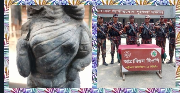 উজ্জ্বল কুমার সরকার ; নওগাঁর পত্নীতলা থেকে আজ ০৩ মে ২০২৫ তারিখ আনুমানিক সারে ১১ টার সময় পত্নীতলা ব্যাটালিয়ন ১৪ বিজিবি এর অধীনস্থ আগ্রাদ্বিগুন বিওপির দায়িত্বপূর্ণ এলাকায় সীমান্ত পিলার ২৫৭/৩-আর হতে আনুমানিক ০৩ কিঃমিঃ বাংলাদেশের অভ্যন্তরে জিআর-৭১৩৮৪৮, মানচিত্র-৭৮সি/১২ নলপুকুর নামক স্থানে পুকুরে মাছ ধরার সময় ০১টি পুরোনো ভাঙ্গা কষ্টি পাথরের মূর্তি দেখতে পায়। পরবর্তীতে স্থানীয় এলাকাবাসী বিজিবি’কে অবগত করলে তাৎক্ষণিক সুবেদার মোঃ তৌফিকুল ইসলাম এর নেতৃত্বে ০৬ সদস্যের একটি বিশেষ টহল দল উক্ত স্থানে গিয়ে স্থানীয় জনগণের সহায়তায় কষ্টি পাথরের মূর্তিটি পুকুর থেকে উদ্ধার করেন। পরবর্তীতে নজিপুর জুয়েলারী সমিতি কর্তৃক পরিক্ষা নিরীক্ষা করে দেখা যায় যে, মূর্তিটি কষ্টি পাথর নয়। উক্ত উদ্ধারকৃত পাথরের মূর্তির ওজন ১.৬৬০ কেজি যার সিজার মূল্য- ধরা হয়েছে ৮৩,০০০= (তিরাশি হাজার) টাকা। নওগাঁ ও জয়পুরহাট সীমান্তে গরু,মাদক পাচার, অবৈধ সীমান্ত পারাপার এবং চোরাচালানের বিরুদ্ধে সর্বদা সর্তক।