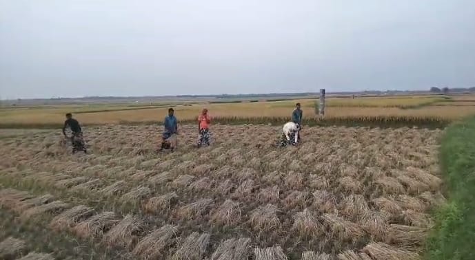 চাঁপাইনবাবগঞ্জ জেলার গোমস্তাপুর উপজেলায় শুরু হয়েছে বোরো মৌসুমের ধান ঘরে তোলার প্রক্রিয়া। মাঠজুড়ে এখন ধান কাটার ব্যস্ততা, কৃষক ও শ্রমিকরা সকাল-সন্ধ্যা পরিশ্রম করে জমি থেকে সোনালী ধান ঘরে তুলছেন। কেউ ধান কাটছেন, কেউ তা পরিবহণ করছেন আবার কেউ মাড়াই কাজে ব্যস্ত রয়েছেন। উপজেলার রহনপুর ইউনিয়নের লক্ষীপুর গ্রামের কৃষক আব্দুল হালিম সি এন বাংলা কে জানিয়েছেন, চলতি মৌসুমে বৃষ্টিপাত কম হওয়ায় ধান কাটার কাজে কোনো বিঘ্ন ঘটেনি। একই সঙ্গে শ্রমিক সংকট না থাকায় সহজেই ফসল ঘরে তুলতে পারছেন তাঁরা। কৃষকদের আশা, অনুকূল পরিবেশ থাকলে এবার বাম্পার ফলনের পাশাপাশি ভালো দামও পাওয়া যাবে ইনশাআল্লাহ। উপজেলা কৃষি অফিস সূত্রে জানা গেছে, এ বছর গোমস্তাপুরে মোট ১৪,৭২৫ হেক্টর জমিতে বোরো ধানের চাষ হয়েছে। এর মধ্যে উফশী জাতের ১৫ প্রকার এবং হাইব্রিড জাতের ৭ প্রকার ধান রোপণ করা হয়েছে। উল্লেখযোগ্য উফশী জাতের ধানের মধ্যে রয়েছে—জিরাশাইল, ব্রিধান-৩৬, ব্রিধান-৮৯, ব্রিধান-৯২, ব্রিধান-২৯, ব্রিধান-১০২ ইত্যাদি। অপরদিকে হাইব্রিড জাতের মধ্যে জনকরাজ, সংকর, ন্যাশনাল-১, ময়না, টিয়া, এসএলএইটএইচ ও পারটেক্স-৩ এর চাষ হয়েছে। উপজেলা কৃষি কর্মকর্তা তানভীর আহমেদ সরকার বলেন, “চলতি মৌসুমে আবহাওয়া অনুকূলে থাকায় ধানের ফলন ভালো হয়েছে। আমরা মাঠ পর্যায়ে কৃষকদের সার্বিক সহায়তা দিয়ে যাচ্ছি যাতে তারা তাদের কষ্টের ফসল সুষ্ঠুভাবে ঘরে তুলতে পারেন।” উপজেলার কৃষি বিভাগ ও কৃষক সমাজের প্রত্যাশা, এ বছর ধানের ভালো ফলনের পাশাপাশি বাজারেও ন্যায্যমূল্য নিশ্চিত হলে তারা অর্থনৈতিকভাবে লাভবান হবেন।