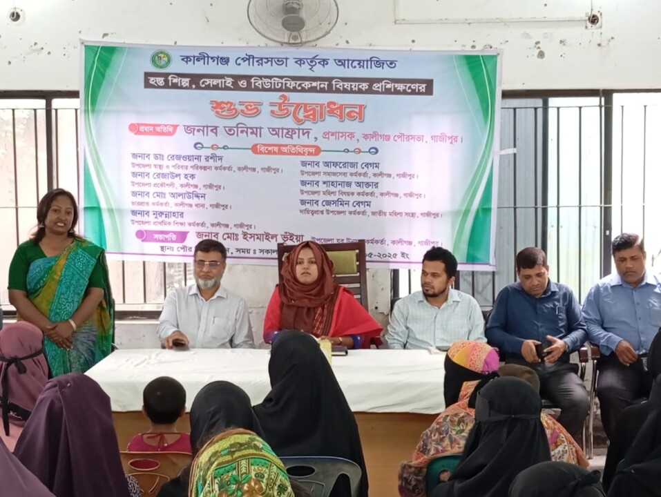 বেকার যুবক/যুবতীদের আত্মকর্মসংস্থান সৃষ্টির লক্ষ্যে কালীগঞ্জ পৌরসভার আয়োজনে ১৫ দিন ব্যাপী সেলাই ও বিউটিফিকেশন বিষয়ক প্রশিক্ষণ শুরু হয়েছে। ‘দক্ষ যুব গড়বো দেশ, বৈষম্যহীন বাংলাদেশ’ এই ¯স্লোগানকে সামনে রেখে রোববার দুপুরে কালীগঞ্জ পৌর হলরুমে এই প্রশিক্ষণ কর্মশালার উদ্বোধন করা হয়। প্রধান অতিথি হিসেবে প্রশিক্ষণের উদ্বোধন করেন কালীগঞ্জ পৌর প্রশাসক তনিমা আফ্রাদ। এছাড়া উপজেলা যুব উন্নয়ন কর্মকর্তার কার্যালয়ের আয়োজনে পাটজাত পণ্য সামগ্রী বিষয়ক ৭ দিন ব্যাপী প্রশিক্ষণ কোর্সের উদ্বোধন করা হয়। তিনটি ট্রেডে ৭০ জন প্রশিক্ষার্থী প্রশিক্ষণে অংশগ্রহণ করেন। আলোচনা সভায় বক্তব্য রাখেন, উপজেলা যুব উন্নয়ন কর্মকর্তা মো.ইসমাইল ভূইয়া, উপজেলা প্রকৌশলী মো. রেজাউল হক, কালীগঞ্জ থানার ভারপ্রাপ্ত কর্মকর্তা মো.আলাউদ্দিন, পৌর প্রকৌশলী মন্নুর আহমেদ প্রমুখ।