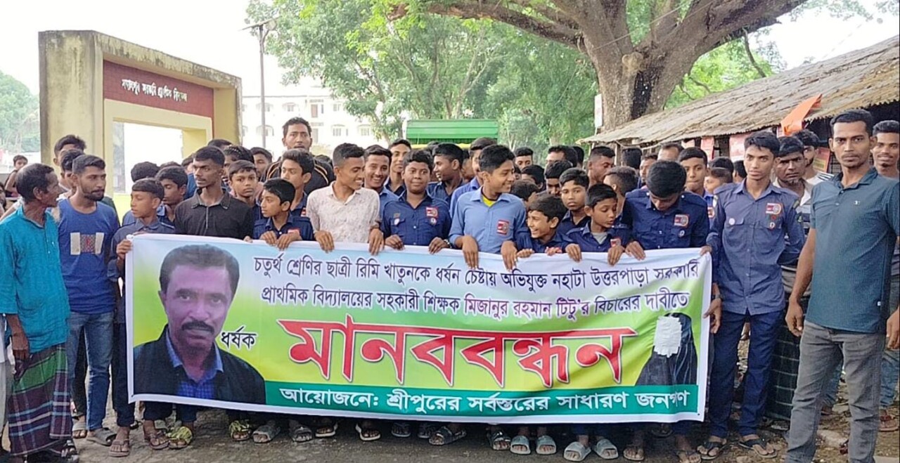 মাগুরা জেলার শ্রীপুরের নোহাটা উত্তরপাড়া সরকারি প্রাথমিক বিদ্যালয়ের সহকারি শিক্ষক মিজানুর রহমান টিটোর বিরুদ্ধে চতুর্থ শ্রেণির এক স্কুল ছাত্রীকে শ্লীলতাহানীর অভিযোগ উঠেছে। ইতিমধ্যে এ বিষয়ে শ্রীপুর থানায় একটি নিয়মিত মামলা করা হয়েছে। এ ঘটনায় উপজেলা ব্যাপী ক্ষোভে ফুঁসে উঠেছে সাধারণ জনগণ। বিভিন্ন মহল থেকে অভিযুক্ত শিক্ষককে গ্রেফতার ও বিচারের দাবি উঠেছে। রবিবার ৪ মে ঐ শিক্ষককে গ্রেফতার ও বিচারের দাবিতে একাধিক স্থানে মানববন্ধন করেছে শ্রীপুর উপজেলার সর্বস্তরের জনগণ। সকালে শ্রীপুর সরকারি কলেজে মানববন্ধন করে শিক্ষার্থীরা। এরপর দুপুরে সব্দালপুর ইউনিয়ন মাধ্যমিক বিদ্যালয়ের সামনে একটি বিশাল মানববন্ধন করে বিদ্যালয়টির শিক্ষার্থী ও এলাকাবাসীরা। মানববন্ধনে শিশু আছিয়ার ঘটনাকে তুলে ধরে একই ইউনিয়নে আবারো এরকম একটি ঘটনার তীব্র নিন্দা জানিয়ে অভিযুক্ত ঐ শিক্ষককে দ্রুত গ্রেফতার ও বিচারের দাবি জানান বক্তারা। এ বিষয়ে স্কুল শিক্ষার্থী তানভীর বলেন, নোহাটা উত্তরপাড়া প্রাথমিক বিদ্যালয়ের শিক্ষক টিটো একজন শিক্ষার্থীকে ধর্ষণের চেষ্টা করেছিলো। আমরা সাধারণ শিক্ষার্থীরা এঘটনার বিচার চাই। আরেক শিক্ষার্থী সাকিল মোল্লা বলেন, আমাদের বোন আছিয়া ধর্ষকের হাতে মারা গিয়েছে। সে রকমই আরেক প্রচেষ্টা করার অভিযোগ দেখলাম শিক্ষক মিজানুর রহমান টিটোর বিরুদ্ধে। তারই স্কুলের এক শিক্ষার্থীকে তিনি ধর্ষণের চেষ্টা করেছেন এবং গায়ে হাত দিয়েছেন। এমনকি তাকে ১০-২০ টাকা দিয়ে প্রলোভন দেখিয়ে ধর্ষণ করার চেষ্টা করেছেন। তাই আমরা চাই এই ঘটনার সঠিক বিচার হোক। মানববন্ধনে মোঃ আল মামুন বলেন, আছিয়া ধর্ষণ ও হত্যাকান্ডের ঘটনা এক মাস যেতে না যেতেই আবার একই ইউনিয়নে শিক্ষকের বিরুদ্ধে ছাত্রীকে ধর্ষণ চেষ্টার ঘটনায় আমরা হতবাক। শিক্ষাঙ্গনে শিশুদের নিরাপত্তা না থাকায় আমরা আমাদের শিশুদের স্কুলে পাঠিয়েও চিন্তামুক থাকতে পারছিনা এসব কুলাঙ্গার শিক্ষকদের কারণে। আমরা এই শিক্ষকের দ্রুত বিচার দেখতে চাই। এ সময় স্থানীয় এক শিক্ষার্থীর অভিভাবক মোঃ হামিম বলেন, মাগুরার আলোচিত হিটু শেখের পর একজন শিক্ষক মিজানুর রহমান টিটো যে লোমহর্ষক ঘটনাটি ঘটিয়েছে আমরা সুষ্ঠু তদন্ত সাপেক্ষে বিচার চাই। বাংলাদেশের বিচার ব্যবস্থা যদি একটু দ্রুত করা হতো তাহলে এই রকম ঘটনা আমাদের অহরহ দেখতে হতোনা। মামলার বাদী শিশুটির চাচা রেজাউল মৃধা ও শিশুটির মা রুমি বেগম জানান, উপজেলার সব্দালপুর ইউনিয়নের নোহাটা উত্তর সরকারি প্রাথমিক বিদ্যালয়ের সহকারি শিক্ষক মিজানুর রহমান টিটো বেশ কিছুদিন ধরেই তার কন্যা ও ওই প্রতিষ্ঠানের চতুর্থ শ্রেণির ছাত্রীকে উত্যক্ত করে আসছিল। এরই এক পর্যায়ে গত ৩০ এপ্রিল বুধবার