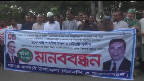 সিনিয়র স্টাফ রিপোর্টার: মোঃ আসিফুজ্জামান আসিফ : বিএনপি চেয়ারপারসন বেগম খালেদা জিয়ার ভাগ্নে, এসোসিয়েশন অব ইঞ্জিনিয়ার্স বাংলাদেশ (AEB)-এর সাবেক মহাসচিব ও নীলফামারী-১ আসনের সাবেক সংসদ সদস্য প্রকৌশলী শাহরিন ইসলাম তুহিনের বিরুদ্ধে দায়েরকৃত সকল “মিথ্যা মামলা” প্রত্যাহার ও তার নিঃশর্ত মুক্তির দাবিতে ঢাকার ধামরাইয়ে বিক্ষোভ মিছিল ও মানববন্ধন কর্মসূচি পালন করেছে বিএনপির নেতাকর্মীরা। ৪ মে (রবিবার) বিকেলে ঢাকা-আরিচা মহাসড়কের ধামরাই উপজেলার বাড়বাড়িয়া এলাকায় এই কর্মসূচি পালন করা হয়। মানববন্ধন ও বিক্ষোভ মিছিলে অংশ নেন ধামরাই উপজেলা বিএনপি ও অঙ্গসংগঠনের নেতাকর্মীরা। অনুষ্ঠানে বক্তব্য রাখেন ঢাকা জেলা বিএনপির উপ-কোষাধ্যক্ষ সোহেল হায়দার চৌধুরী কবির। তিনি বলেন, “প্রকৌশলী শাহরিন ইসলাম তুহিনের বিরুদ্ধে দায়ের করা মামলাগুলো সম্পূর্ণ রাজনৈতিক উদ্দেশ্যপ্রণোদিত। অবিলম্বে তার নিঃশর্ত মুক্তি দিতে হবে।” বিএনপি নেতারা আরও বলেন, বর্তমান সরকার বিরোধী নেতাদের হয়রানি করতে একের পর এক মিথ্যা মামলা দায়ের করছে, যা গণতন্ত্রের পরিপন্থী। বিক্ষোভ শেষে নেতাকর্মীরা দ্রুত তুহিনের মুক্তি ও সকল মামলা প্রত্যাহারের দাবি জানান।