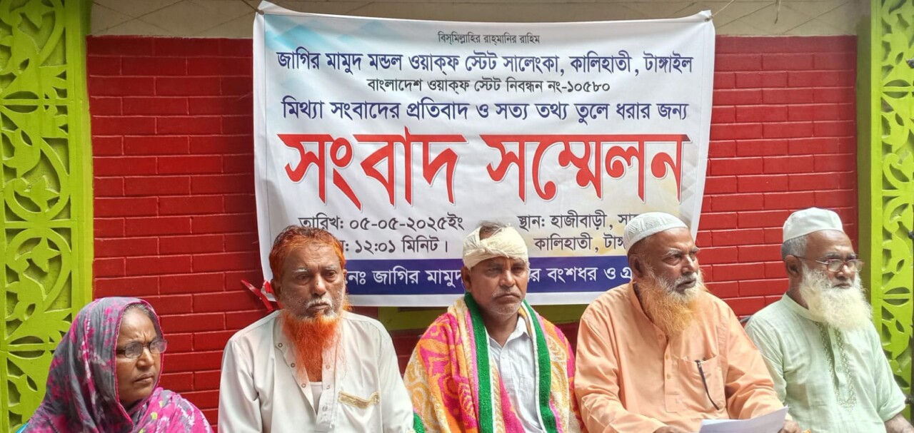 টাঙ্গাইলের কালিহাতী উপজেলার সালেংকা গ্রামে অবস্থিত জাগির মামুদ মণ্ডল ওয়াক্ফ টেস্ট (নিবন্ধন নং ১০৫৮০) নিয়ে প্রকাশিত মিথ্যা সংবাদের প্রতিবাদ ও সঠিক তথ্য তুলে ধরতে সংবাদ সম্মেলন করেছেন ওয়াকফটির প্রতিষ্ঠাতা পরিবারের বংশধর ও গ্রামবাসী। ৫ মে (সোমবার) দুপুড়ে আয়োজিত সংবাদ সম্মেলনে লিখিত বক্তব্য পড়েন দায়িত্বপ্রাপ্ত মোতাওয়াল্লী মোসলেম উদ্দিন। তিনি জানান, জাগির মাহমুদ মন্ডলের বংশধর না হয়েও কিছু ব্যক্তি নিজেদের বংশধর পরিচয় দিয়ে আমাদের বিরুদ্ধে সাংবাদিক সম্মেলন করেছেন। বাংলাদেশ আইনে পিতার দিকের উত্তরসূরীই বৈধ বংশধর। যাঁরা মিথ্যা দাবিতে সংবাদ সম্মেলন করেছেন, তাঁদের কেউ-ই জাগির মাহমুদের পিতৃসূত্রীয় উত্তরসূরী নন। তিনি আরও জানান, ওয়াক্ফ দলিল অনুযায়ী ওয়াক্ফ দাতা জাগির মাহমুদ মন্ডল প্রথম মোতাওয়াল্লী ছিলেন। পরবর্তীতে দায়িত্ব পান তার স্ত্রী চিনিতন নেছা এবং পালক পুত্র কলিম উদ্দিন সরকার। এরপর ১৯৭৯ সালে আদালতের আদেশে সিরাজ হাজী পঞ্চম মোতাওয়াল্লী নিযুক্ত হন। পরে একে একে দায়িত্ব পালন করেন আমজাদ হোসেন, সোরহাব আলী ও আব্দুল আজিজ। ২০১৬ সালে কলিম উদ্দিন সরকারের মেয়ে জাহানারা বেগম মোতাওয়াল্লী দাবিতে হাইকোর্টে একটি মামলা (নং-৫৮২০) দায়ের করেন, যা ২০২৩ সালে খারিজ করে আব্দুল আজিজকেই বহাল রাখা হয়। তার মৃত্যুর পর মোতাওয়াল্লী হিসেবে দায়িত্ব পান মোসলেম উদ্দিন। তিনি অভিযোগ করেন, সম্প্রতি প্রতিপক্ষের দুলাল ও তার দুই ছেলে লতিফ মন্ডলের ওপর অতর্কিত হামলা চালায়। বর্তমানে লতিফ মন্ডল গুরুতর আহত অবস্থায় চিকিৎসাধীন রয়েছেন। মোসলেম উদ্দিন বলেন, “আমি জাগির মাহমুদের বংশধর এবং গ্রামবাসীর সম্মতিক্রমে দায়িত্বে রয়েছি। আমরা সকলে মিলে নির্বাচিত স্থানে মসজিদ নির্মাণের দাবি জানাচ্ছি।” এ সময় উত্তেজিত গ্রামবাসীরা মসজিদ নির্মাণের জোর দাবি জানান। সংবাদ সম্মেলনে উপস্থিত ছিলেন মসজিদ কমিটির সভাপতি আব্দুস সালাম, হযরত আলী, আব্দুল লতিফ, রোজিনা আক্তার, আব্দুর বারেকসহ গ্রামবাসী।