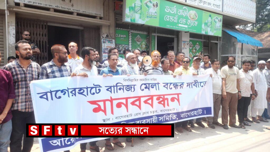 তরিকুল মোল্লা : বাগেরহাট পৌর পার্কে আসন্ন বাণিজ্য মেলা বন্ধের দাবিতে মানববন্ধন অনুষ্ঠিত হয়েছে। বৃহস্পতিবার (৮ এপ্রিল) বাগেরহাট প্রেসক্লাবের সামনে ঘণ্টাব্যাপী এই মানববন্ধনের আয়োজন করে জেলার সম্মিলিত ব্যবসায়ী সমিতি। মানববন্ধনে সভাপতিত্ব করেন সংগঠনের আহ্বায়ক শেখ মইনুল ইসলাম মোস্তফা। এ সময় বক্তব্য রাখেন সদস্য সচিব মোঃ নজরুল ইসলাম রুনু, বাগেরহাট সোসাইটির সাধারণ সম্পাদক মঞ্জুরুল ইসলাম মঞ্জু, সদস্য কাজী লিটন, আসলাম মোল্লা, খান নজরুল ইসলাম, জগলুল হায়দার জাকির, আশোক, আতিয়ার রহমান, শেখ মাহিনুর রহমান, মো. ফারুক হোসেন, মোঃ জাকির হোসেন, শামীম বেগ, ণিলয় ভদ্র, ফয়সাল আহমেদ ও মনিরুল ইসলাম প্রমুখ । মানববন্ধনে স্থানীয় ব্যবসায়ীরা জানান , এই মেলার কারণে তাদের নিয়মিত ব্যবসায় ব্যাপক ক্ষতি হবে। মেলায় ভ্রাম্যমাণ বিক্রেতাদের আগমন ও সস্তা দামে পণ্য বিক্রির ফলে স্থায়ী দোকানগুলোর বিক্রয় হ্রাস পাবে বলে তারা আশঙ্কা প্রকাশ করেছেন। ব্যবসায়ী সমিতির নেতারা আরো জানান, “প্রতি বছর এই মেলার কারণে আমাদের ব্যবসায়ীরা কোটি কোটি টাকার ক্ষতির মুখে পড়েন। কর্তৃপক্ষের উচিত স্থানীয় ব্যবসায়ীদের স্বার্থ বিবেচনা করে মেলা বন্ধ করা। স্থানীয় প্রশাসন ও জেলা প্রশাসকের কাছে ব্যবসায়ী নেতারা মেলা বন্ধের দাবি জানিয়েছেন। বগুড়ার একটি ইভেন্ট ম্যানেজমেন্ট প্রতিষ্ঠান “মনটু ইভেন্ট ম্যানেজমেন্ট” এই বাণিজ্য মেলার আয়োজন করেছে। বর্তমানে দেশে বিভিন্ন পাবলিক পরীক্ষা চলমান থাকায় এমন আয়োজন শিক্ষার পরিবেশের জন্য হুমকিস্বরূপ। এছাড়া শহরের একমাত্র বিনোদনকেন্দ্র বাগেরহাট পৌর পার্ক যেখানে মেলা বসলে পরিবেশ ও শব্দ দূষণ বৃদ্ধি পাবে, তৈরি হবে জুয়ার আসর। যা তরুণ সমাজকে ধ্বংসের দিকে ঠেলে দেবে। তাই অবিলম্বে এই বাণিজ্য মেলা বন্ধের দাবি জানান এবং প্রশাসনের হস্তক্ষেপ কামনা করেন। মানববন্ধন ও বিক্ষোভ শেষে ব্যবসায়ীরা একটি স্বারকলিপি জেলা প্রশাসকের হাতে তুলে দিয়ে এই বানিজ্য মেলা বন্ধের আহবান জানান।