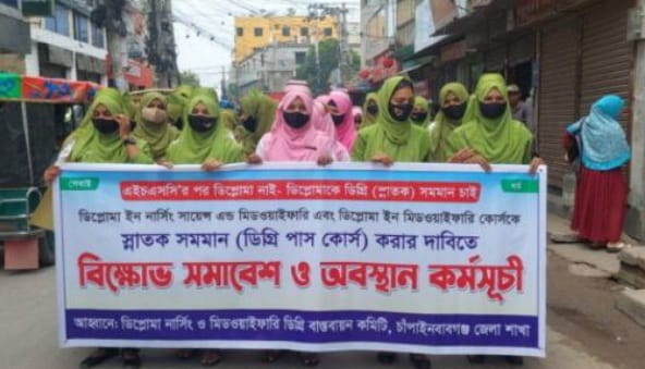 ডিপ্লোমা ইন নার্সিং সায়েন্স অ্যান্ড মিডওয়াইফারি এবং ডিপ্লোমা এন্ড মিডওয়াইফারি কোর্সের সনদকে স্নাতক (পাস) ডিগ্রির সমমান দেওয়ার দাবিতে চাঁপাইনবাবগঞ্জে বিক্ষোভ সমাবেশ ও অবস্থান কর্মসূচি পালন করেছেন জেলার নার্সিং কলেজের শিক্ষার্থীরা। সোমবার (১২ মে) সকাল ১০ টায় চাঁপাইনবাবগঞ্জ বাতেন খাঁ মোড়ে ডিপ্লোমা নার্সিং মিড ওয়াইফারি ডিগ্রী বাস্তবায়ন কমিটি, চাঁপাইনবাবগঞ্জ জেলা শাখার আয়োজনে এই কর্মসূচী অনুষ্ঠিত হয়। সমাবেশ চাঁপাইনবাবগঞ্জ নার্সিং কলেজের শিক্ষার্থী শিরিন আক্তার (ইবাদি) বলেন, আমরা এসএসসি পাস করার পর ভর্তি পরীক্ষা দিয়েই এই কোষে ভর্তি হয়েছি। এখানে তিন বছর মেয়াদী কোর্স সম্পন্ন করতে হয়। তাই সরকারের নিকট আমাদের দাবি, ডিপ্লোমা ডিগ্রীকে স্নাতক (পাস) সমমান দিতে হবে। অন্য একজন শিক্ষার্থী বলেন, আমাদের এই দাবি দীর্ঘদিন ধরে উপেক্ষিত হচ্ছে। নতুন সরকারের কাছে আমাদের প্রত্যাশা, এই বৈষম্য দূর করে আমাদের শিক্ষাগত মর্যাদা প্রতিষ্ঠিত করা হবে। বিক্ষোভ শেষে জেলা প্রশাসকের কাছে স্মারকলিপি জমা দিয়ে কর্মসূচি সমাপ্ত করা হয়।