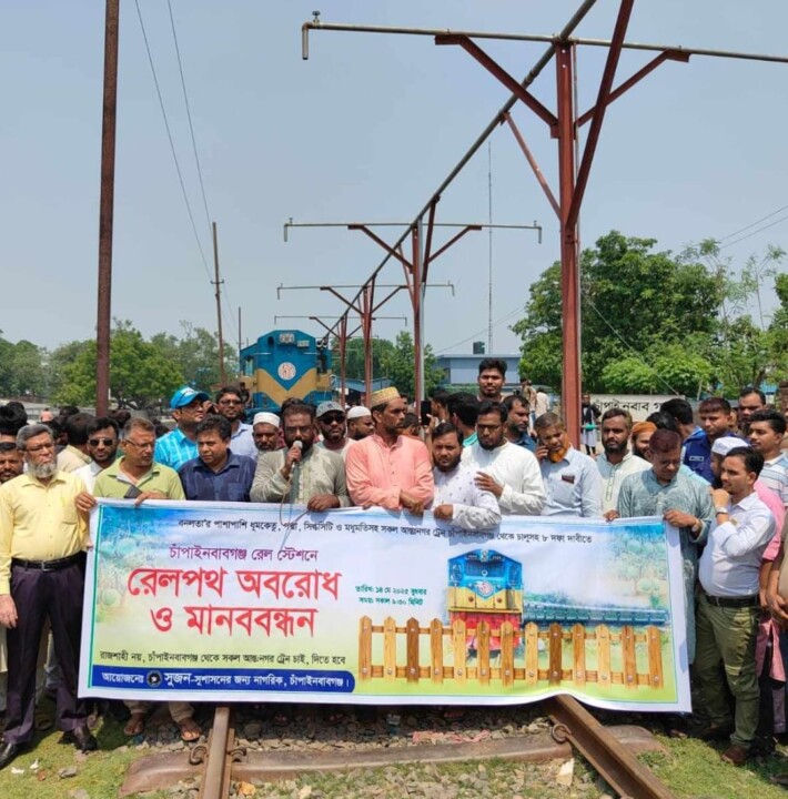 চাঁপাইনবাবগঞ্জে আন্তঃনগর ট্রেন চালুর দাবীতে ট্রেন অবরোধ ও মানববন্ধন কর্মসূচী পালন