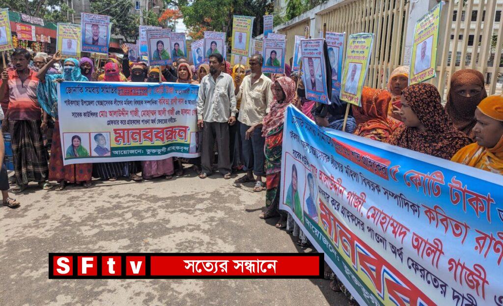 পাইকগাছার বহুল আলোচিত জোনাকি গ্রাম উন্নয়ন সমবায় সমিতির গ্রাহকদের উদ্যোগে মানববন্ধন ও বিক্ষোভ মিছিল অনুষ্ঠিত হয়েছে। সমিতির ২২’শ গ্রাহকের ৫ কোটি টাকা আত্মসাৎকারী উপজেলা স্বেচ্ছাসেবক লীগের মহিলা সম্পাদিকা ও সমিতির আদায়কারী সাবেক কাউন্সিলর কবিতা দাশ, সমিতির নির্বাহী পরিচালক আওয়ামী লীগের সাবেক কাউন্সিলর আলাউদ্দিন গাজী, সভাপতি মোহাম্মদ আলী গাজী ও আদায়কারী সালমা বেগম কে গ্রেফতার করে গ্রাহকদের পাওনা অর্থ ফেরত এবং পৌরসভা বিএনপির মোস্তফা মোড়ল এর দলীয় যুগ্ম আহবায়ক পদের অব্যাহতি প্রত্যাহার করে স্বপদে বহাল করার দাবিতে বিক্ষুব্ধ গ্রাহকরা রোববার সকালে উপজেলা পরিষদের সামনে মানববন্ধন করে। মানববন্ধনে শত শত নারী ও পুরুষ দাবি সম্বলিত বিভিন্ন প্যানা, ফেস্টুন ও প্লা কার্ড নিয়ে অংশ নেয়। মানববন্ধন শেষে গ্রাহকরা বিক্ষোভ মিছিল করে উপজেলা পরিষদের সামনে গিয়ে তাদের পাওনা টাকা ফেরত সহ সমিতির আলাউদ্দিন, কবিতা, মোহাম্মদ ও সালমা’র গ্রেফতার এবং বিএনপি নেতা মোস্তফা’র দলীয় অব্যাহতি প্রত্যাহারের দাবি জানান। এসময় বক্তব্য রাখেন বিএনপি নেতা ইমদাদুল হক, যুবদল নেতা আবু হুরায়রা বাদশা, সিরাজুল ইসলাম, আমজাদ হোসেন, আলাউদ্দিন মোড়ল, সাজ্জাদ আলী ফকির, মুন্নী বেগম, মনিরুল ইসলাম, নাজমা বেগম, আজহারুল ইসলাম, মতিয়ার রহমান, শাহিদা বেগম, আব্দুল হামিদ, ময়না বেগম, বিশ্বনাথ সাধু, শহিদুল ইসলাম, শরিফা বেগম, ও খুকুমণি। পরবর্তীে উপজেলা সমবায় কর্মকর্তা হুমায়ূন কবির গ্রাহকদের সাথে কথা বলেন। এসময় সমবায় বিভাগের এ কর্মকর্তা বলেন টাকা ফেরত পাওয়ার বিষয় নিয়ে উপজেলা নির্বাহী অফিসার ও থানার ওসি’র সাথে কথা বলা হয়েছে। গ্রাহকরা যাতে দ্রুত টাকা ফেরত পায় প্রশাসন এবং সমবায় বিভাগ থেকে সর্বাত্মক সহোযোগিতা এবং চেষ্টা করা হবে। উল্লেখ্য সমিতির সাধারণ গ্রাহকরা ৩ বছরের ও অধিক সময় ধরে তাদের জমাকৃত টাকা ফেরত পাওয়ার দাবি জানিয়ে আসছে। মাঝপথে উভয় পক্ষের সাথে আলোচনা করে সমাধানের উদ্যোগ নেওয়া হলেও ফলপ্রসু কোন কিছু না হওয়ায় ভুক্তভোগী গ্রাহকরা আবারো দাবি আদায়ের ব্যাপারে সোচ্চার হয়। হয়রানি মূলক কোন মামলা, গ্রেফতার কিংবা বহিষ্কার করে দাবি আদায় থেকে গ্রাহকদের পিছু হটানো যাবে না উল্লেখ করে সর্বশেষ রবিবারের কর্মসূচিতে দিনমজুর অসহায় ক্ষতিগ্রস্ত গ্রাহকদের পাশে থাকার জন্য সকলের প্রতি আহবান জানান তারা।