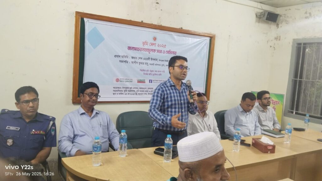 ভূমি মেলা ২০২৫ উপলক্ষে চুয়াডাঙ্গার আলমডাঙ্গা উপজেলায় অনুষ্ঠিত হলো এক জনসচেতনতামূলক সভা ও সেমিনার। সোমবার (২৬ মে) আলমডাঙ্গা উপজেলা পরিষদ সভাকক্ষে এই সভার আয়োজন করে উপজেলা ভূমি অফিস, ভূমি সংস্কার বোর্ড এবং ভূমি ব্যবস্থাপনা অটোমেশন প্রকল্প। অনুষ্ঠানে প্রধান অতিথি হিসেবে উপস্থিত ছিলেন আলমডাঙ্গা উপজেলা নির্বাহী অফিসার শেখ মেহেদী ইসলাম। সভাপতিত্ব করেন সহকারী কমিশনার (ভূমি) আশীষ কুমার বসু। বিশেষ অতিথি হিসেবে উপস্থিত ছিলেন উপজেলা মাধ্যমিক শিক্ষা অফিসার জিয়াউল হক, আলমডাঙ্গা মহিলা ডিগ্রী কলেজের অধ্যক্ষ আশুরা খাতুন, সরকারি কলেজের সহকারী অধ্যাপক ড. মাহবুব আলম এবং মাধ্যমিক বালিকা বিদ্যালয়ের প্রধান শিক্ষক মনিরুজ্জামান। সভায় ভূমি উন্নয়ন কর, অনলাইনে ভূমি সেবা গ্রহণ, জমির ডিজিটাল রেকর্ড সংরক্ষণসহ ভূমি ব্যবস্থাপনার আধুনিকায়ন বিষয়ে বিস্তারিত আলোচনা হয়। বক্তারা বলেন, “নিয়মিত ভূমি উন্নয়ন কর প্রদান করি, নিজের জমি সুরক্ষিত রাখি।” অনুষ্ঠানে আরও বক্তব্য রাখেন ইউপি ভূমি সহকারী কর্মকর্তা মোল্লা মতিয়ার রহমান, মিজানুর রহমান, আমজাদ হোসেন, মিনারুল ইসলাম, রেজাউল ইসলাম, ইশা খান, ইসমাইল হোসেন ও ফরিদুর রহমান। অনুষ্ঠানটি সঞ্চালনা করেন উপজেলা ভূমি অফিসের নাজির সাজেদুর রহমান। এছাড়াও বিভিন্ন সামাজিক ও পেশাজীবী সংগঠনের প্রতিনিধিরা সভায় অংশগ্রহণ করেন এবং ভূমি সেবার উন্নয়নে সরকারের উদ্যোগের প্রশংসা করেন। প্রধান অতিথি শেখ মেহেদী ইসলাম বলেন, “সময়মতো ভূমি উন্নয়ন কর পরিশোধের মাধ্যমে জমির মালিকানা যেমন সুরক্ষিত থাকে, তেমনি বাড়ে রাষ্ট্রীয় রাজস্ব।” তিনি আরও বলেন, “বর্তমান সরকার ভূমি ব্যবস্থাকে ডিজিটালাইজেশনের মাধ্যমে সাধারণ মানুষের কাছে সহজলভ্য ও স্বচ্ছ সেবা নিশ্চিত করছে।” সহকারী কমিশনার (ভূমি) আশীষ কুমার বসু জানান, ভূমি মেলার মূল উদ্দেশ্য হলো ভূমি-সংক্রান্ত সেবা সাধারণ মানুষের দোরগোড়ায় পৌঁছে দেওয়া। তিনি বলেন, মেলায় খতিয়ান উত্তোলন, নামজারি, জমা খারিজ ও অনলাইনে ভূমি কর পরিশোধসহ বিভিন্ন ডিজিটাল সেবা প্রদান করা হচ্ছে। তিন দিনব্যাপী এই ভূমি মেলাটি সর্বস্তরের মানুষের মাঝে ব্যাপক সাড়া ফেলেছে। স্থানীয়রা জানান, এমন আয়োজন মানুষের ভোগান্তি কমাবে এবং ভূমি প্রশাসনের প্রতি আস্থা বৃদ্ধি করবে।