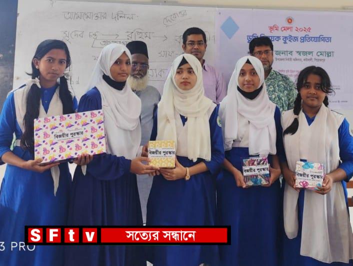 মোঃ নুরুজ্জামান খোকন : পিরোজপুরের কাউখালী উপজেলা ভূমি অফিসের উদ্যোগে,ভূমি মেলা-২০২৫ উপলক্ষে, গতকাল ২৫শে মে সকাল ১০ঘটিকার সময় আনুষ্ঠানিকভাবে শুভ উদ্বোধন করেন উপজেলা নির্বাহী কর্মকর্তা স্বজল মোল্লা,এ সময় উপস্থিত ছিলেন উপজেলা কমিশনার (ভূমি) সুদীপ্ত দেবনাথ সহ ৫টি ইউনিয়নের পেশকার ও অন্যান্য কর্মকর্তা বৃন্দ। উক্ত ভূমি মেলায় স্মার্ট ভূমি সেবা পেতে ভূমি মন্ত্রণালয়ের অধীনে ভূমি উন্নয়ন কর,খতিয়ান পর্চা, ই-নামজারি জমির ম্যাপ,এছাড়াও ভূমি বিষয়ক পরামর্শ পেতে এবং অভিযোগ জানাতে তিন দিনব্যাপী উক্ত মেলার আয়োজন।পরবর্তীতে ২৬শে মে সোমবার ভূমি উন্নয়ন কর প্রদান ও জমির সুরক্ষা নিশ্চিত করার লক্ষ্যে কাউখালী এসবি সরকারি বালিকা উচ্চ বিদ্যালয়ের ৫০জন শিক্ষার্থীদের মাঝে,ভূমি সেবা বিষয়ক আলোচনা শেষে, “নিয়মিত ভূমি উন্নয়ন কর প্রদান করি,নিজের জমি সুরক্ষিত রাখি” এই বক্তব্যের উপরে ভুমি মেলা- ২০২৫ এর উপরে একটি কুইজ প্রতিযোগিতার আয়োজন করা হয়। প্রতিযোগিতা শেষে মেধা বিকাশে বিজয়ী ৯জন ছাত্রীকে পুরস্কার বিতরণ করা হয়। উক্ত কুইজ প্রতিযোগিতা অনুষ্ঠানের সভাপতিত্ব করেন,বিদ্যালয়ের প্রধান শিক্ষক মোঃ রফিকুল ইসলাম। অনুষ্ঠানের প্রধান অতিথি হিসেবে উপস্থিত ছিলেন, উপজেলা সহকারী কমিশনার (ভূমি)সুদীপ্ত দেবনাথ। এ ছাড়াও বিদ্যালয়ের সিনিয়র সহকারী শিক্ষক মোস্তফা কামাল,মোঃ তানভিন হোসেন,মুন্নি খানম প্রমুখ উপস্থিত ছিলেন। এ সময় উপজেলা কমিশনার (ভূমি) কর্মকর্তা, সুদীপ্ত দেবনাথ বলেন,বাংলাদেশের প্রতিটি উপজেলায় গতকাল ২৫ মে থেকে ভূমি মেলা ও ভূমি সেবার পাশাপাশি,বর্তমান প্রজন্মের শিক্ষার্থীদের মধ্যে এই ধরনের উদ্যোগ ভূমি বিষয়ক সচেতনতা বৃদ্ধি করতে জ্ঞান-বিকাশে এবং যেকোনো সমস্যা সমাধানে সহায়ক হবে বলে বিশ্বাস করেন।