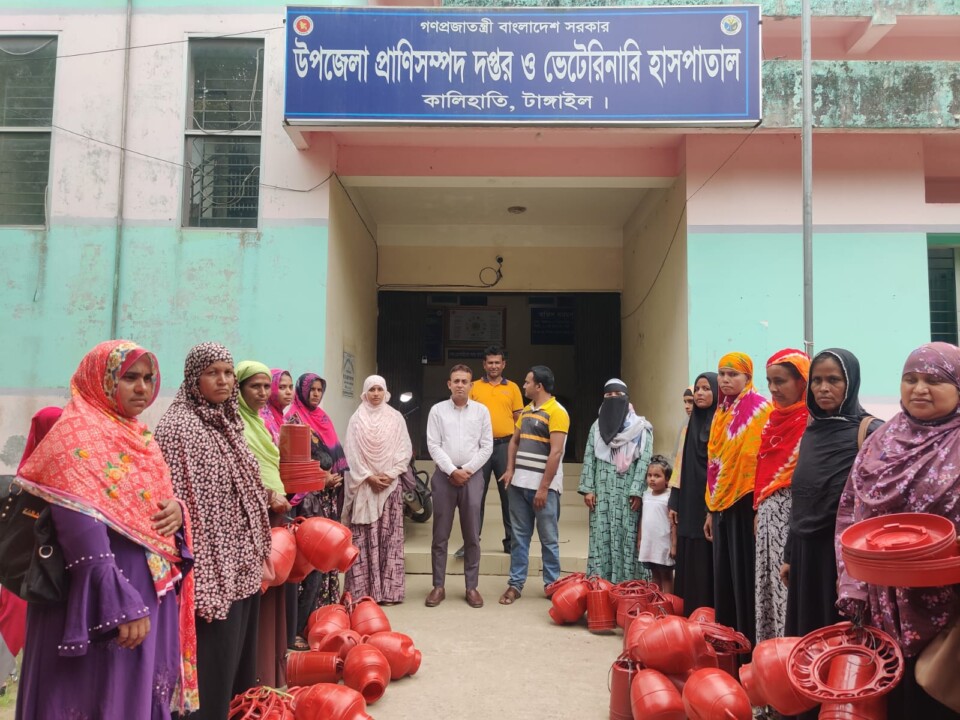 টাঙ্গাইলের কালিহাতী উপজেলায় প্রাণিসম্পদ ও ডেইরি উন্নয়ন প্রকল্পের আওতায় ৪০ জন মুরগি পালনকারী পিজি সদস্যের মাঝে ফিডার ও ড্রিংকার বিতরণ করা হয়েছে। সোমবার বিকেলে উপজেলা প্রাণিসম্পদ কার্যালয় প্রাঙ্গণে এই উপকরণ বিতরণ কার্যক্রম অনুষ্ঠিত হয়। এতে প্রধান অতিথি হিসেবে উপস্থিত ছিলেন উপজেলা প্রাণিসম্পদ কর্মকর্তা ডা. আবু সাইম আল সালাউদ্দিন। এছাড়াও উপস্থিত ছিলেন ভেটেরিনারি সার্জন ডা. সীমান্ত, পৌরসভার এলএসপি (LSP), এবং প্রকল্পভুক্ত সুফলভোগী খামারীবৃন্দ। প্রাণিসম্পদ কর্মকর্তারা জানান, খামারীদের আধুনিক ও টেকসই খামার ব্যবস্থাপনায় উদ্বুদ্ধ করতে এবং উৎপাদন সক্ষমতা বৃদ্ধির লক্ষ্যে এই সহায়তা প্রদান করা হয়েছে। অনুষ্ঠানে খামারীদের উদ্দেশ্যে খামার ব্যবস্থাপনা, রোগ প্রতিরোধ ও সুষম খাদ্য ব্যবস্থাপনা বিষয়ে দিকনির্দেশনামূলক পরামর্শ দেওয়া হয়। উপজেলার প্রাণিসম্পদ বিভাগ আশাবাদী, এ ধরনের কার্যক্রম খামারীদের আয় বৃদ্ধি ও ডিম-মুরগির উৎপাদন বৃদ্ধিতে উল্লেখযোগ্য ভূমিকা রাখবে।