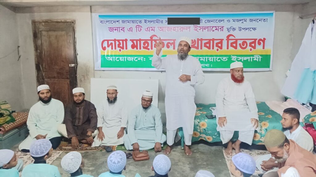বাংলাদেশ জামায়াতে ইসলামীর সাবেক ভারপ্রাপ্ত সেক্রেটারি জেনারেল এবং মজলুম জননেতা এ টি এম আজহারুল ইসলামের মুক্তি উপলক্ষে জয়পুরহাট সদর উপজেলা জামায়াতের উদ্যোগে এক দোয়া মাহফিল ও খাবার বিতরণের আয়োজন করা হয়েছে।বুধবার সকাল ৮টায় সদর উপজেলার একটি স্থানীয় এতিমখানায় এই অনুষ্ঠান অনুষ্ঠিত হয়। দোয়া মাহফিল ও খাবার বিতরণে অংশগ্রহণ করেন জামায়াতের বিভিন্ন স্তরের নেতৃবৃন্দ, স্থানীয় গণ্যমান্য ব্যক্তিবর্গ।অনুষ্ঠানে সভাপতিত্ব করেন সদর উপজেলা জামায়াতের আমীর মোঃ ইমরান হোসেন এবং সঞ্চালনায় ছিলেন উপজেলা সেক্রেটারি মাওলানা জয়নাল আবেদীন।প্রধান অতিথি হিসেবে উপস্থিত ছিলেন বাংলাদেশ জামায়াতে ইসলামীর কেন্দ্রীয় মজলিসে শূরার অন্যতম সদস্য, জয়পুরহাট জেলা জামায়াতের আমীর এবং আসন্ন জাতীয় সংসদ নির্বাচনে জামায়াত মনোনীত সংসদ সদস্য (এমপি) প্রার্থী ডাঃ ফজলুর রহমান সাঈদ।বিশেষ অতিথি হিসেবে উপস্থিত ছিলেন কেন্দ্রীয় মজলিসে শূরার সদস্য ও জয়পুরহাট জেলা জামায়াতের সেক্রেটারি মাওলানা গোলাম কিবরিয়া মন্ডল।এছাড়াও উপস্থিত ছিলেন বম্বু ইউনিয়ন জামায়াতের আমীর মাওলানা আসাদুল ইসলাম আসাদ, ইউনিয়ন সেক্রেটারি আশরাফ আলীসহ স্থানীয় জামায়াত নেতৃবৃন্দ ও সুধী সমাজের ব্যক্তিবর্গ।দোয়া মাহফিলে জামায়াতে ইসলামীর শহীদ নেতৃবৃন্দের জন্য শাহাদাতের মর্যাদা এবং এ টি এম আজহারুল ইসলামের সুস্থতা ও দীর্ঘ নেক হায়াত কামনা করে বিশেষ মোনাজাত পরিচালনা করেন জেলা আমীর ডাঃ ফজলুর রহমান সাঈদ।দোয়া মাহফিল শেষে এতিম শিশু ও হাফেজে কোরআনদের মাঝে খাবার বিতরণ করা হয়।